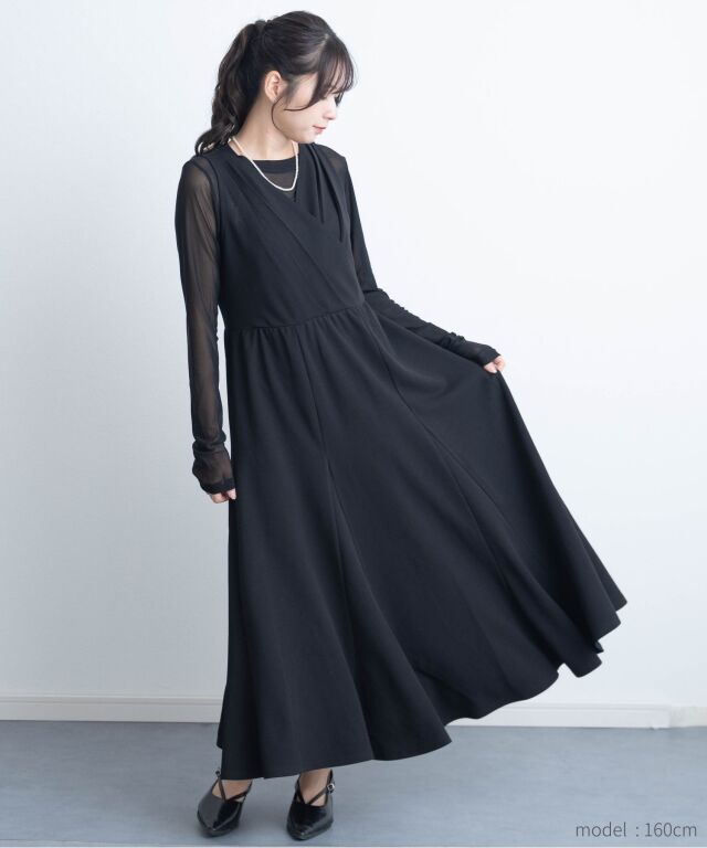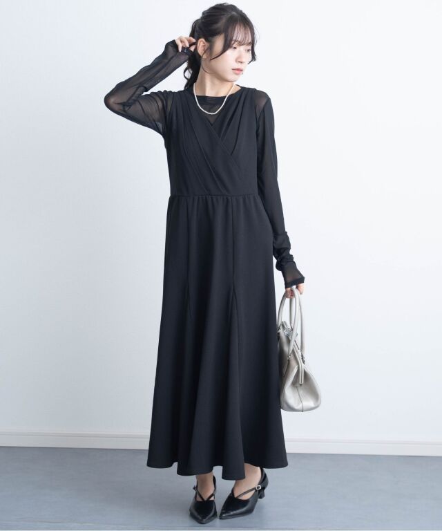 タックを寄せたカシュクールと高めのウエスト切替が、妊娠中でもすっきりとした印象を演出します。