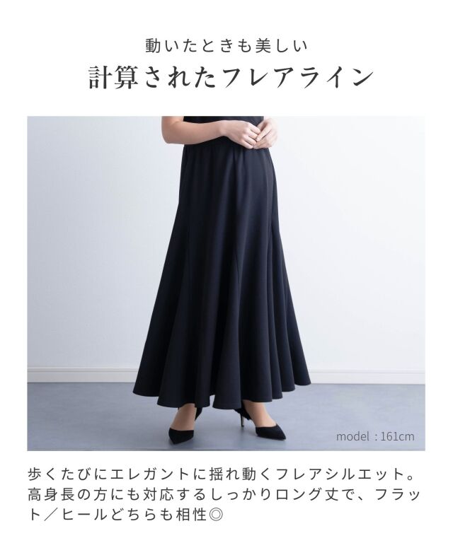 高身長さんでもバランスよく着られるしっかりロング丈に、歩くたびにエレガントに揺れ動くフレアシルエットが上品。