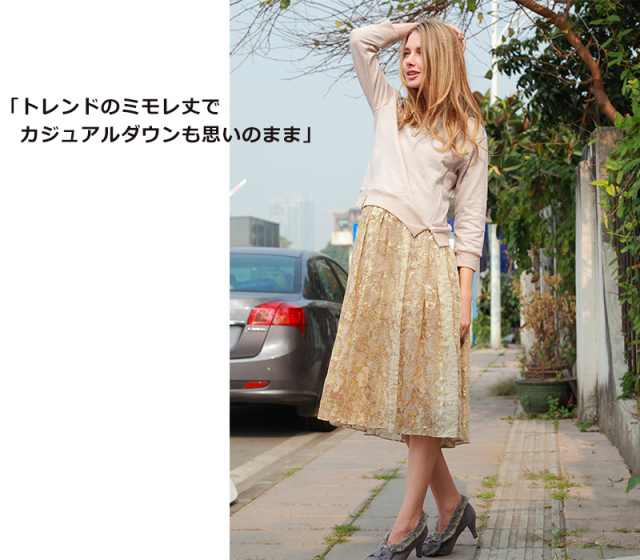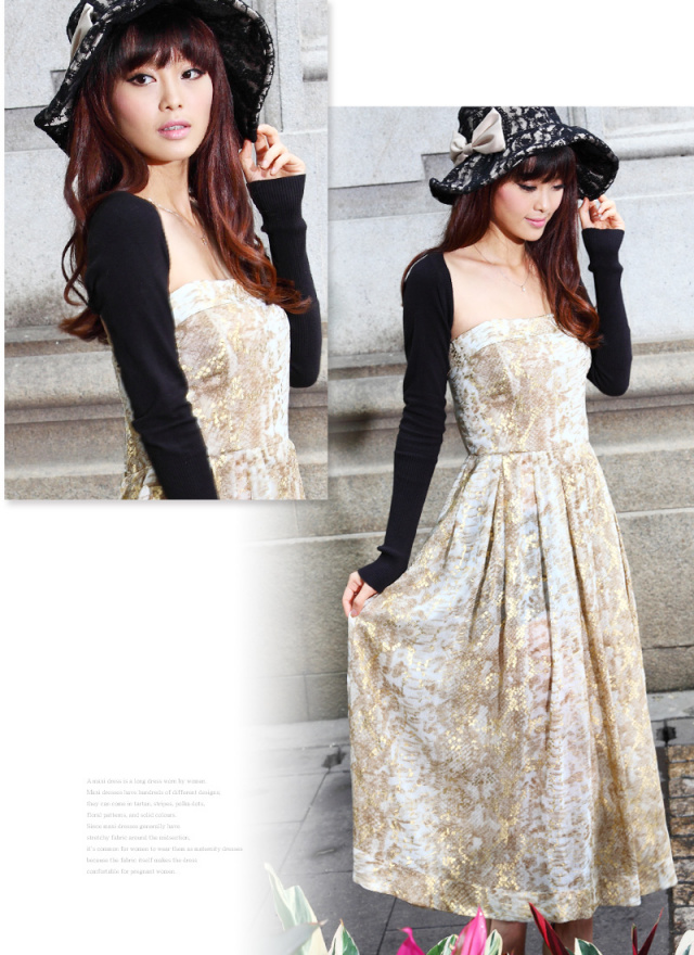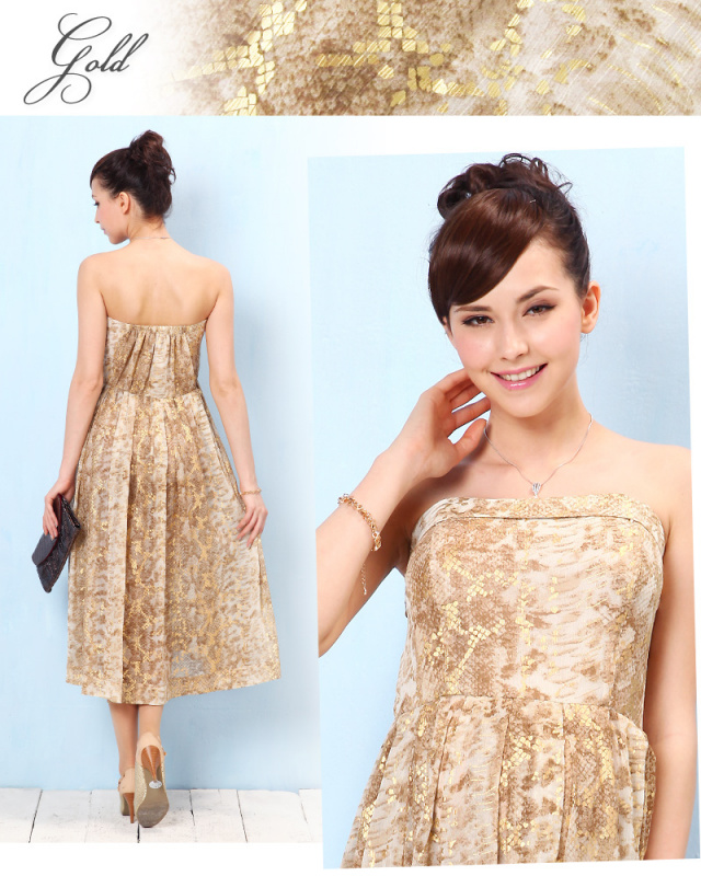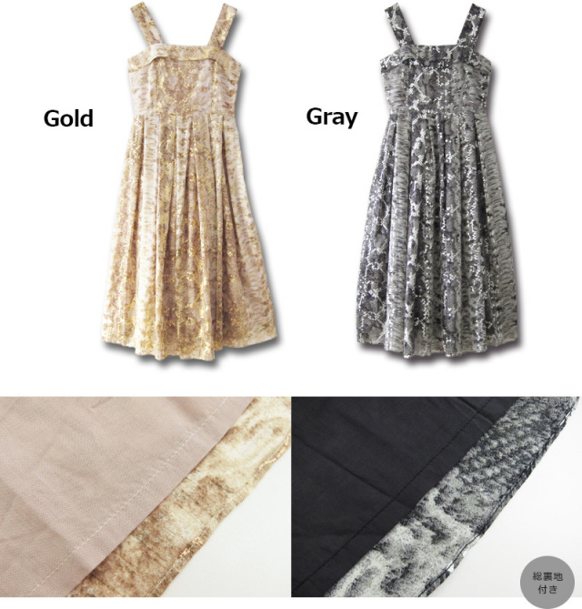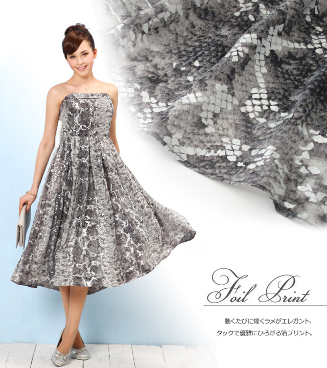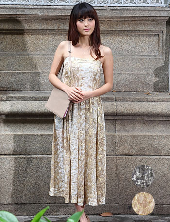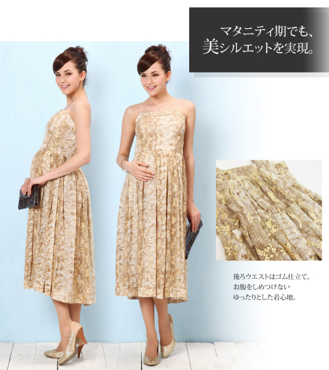 動きに合わせてキラリと光る箔プリントが抜群の存在感を感じさせるワンピ。肩紐を取り外して、ベアトップワンピにすると、ワンランク上のイブニングドレスに。2WAYの着こなしが楽しめるワンピです。マタニティウェアと授乳服の通信販売スウィートマミー。