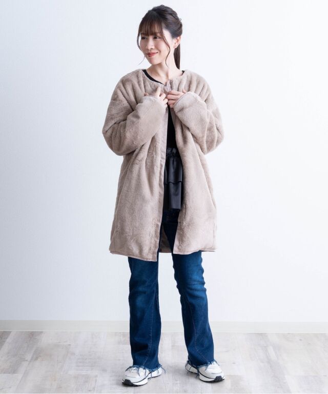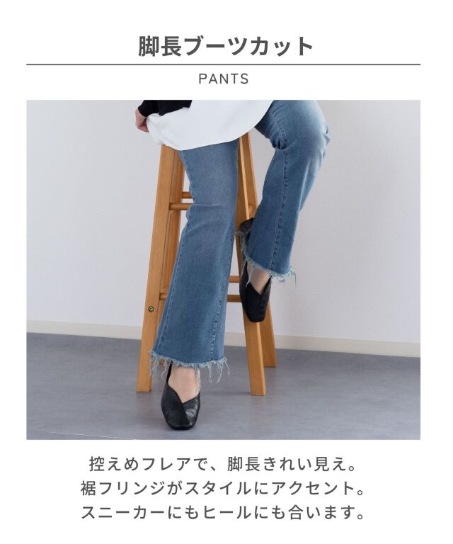 控えめフレアで、足長きれい見え。裾フリンジがスタイルにアクセント。