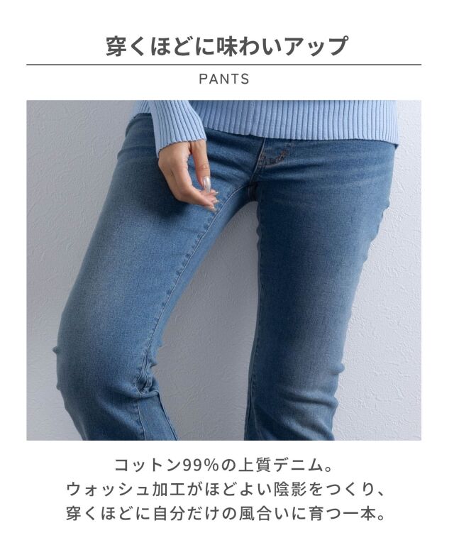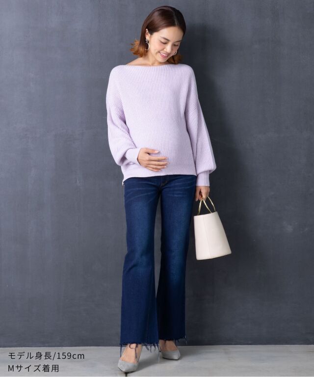 ストリートスタイルの定番ブーツカットを、マタニティデニムに!70年代を思わせるヴィンテージライクなシルエット。膝下からのフレアシルエットは足長・美脚効果大!妊娠中から産後まで活躍するおしゃれなマタニティボトム。マタニティウェア・授乳服のスウィートマミー【公式】