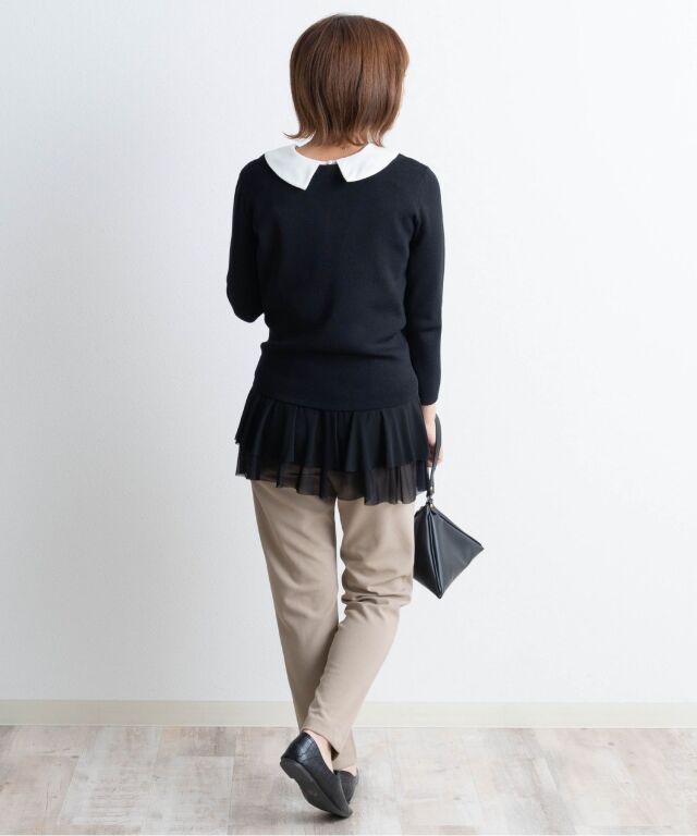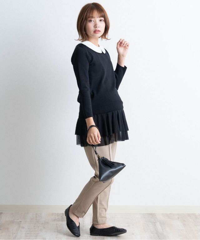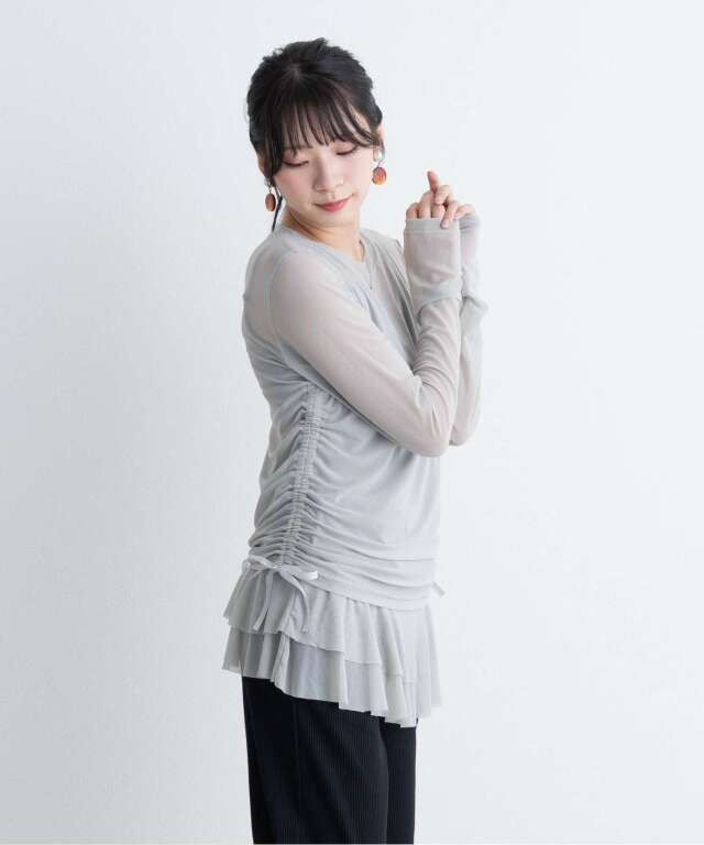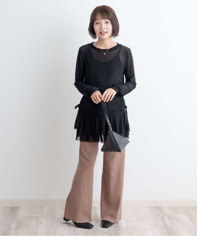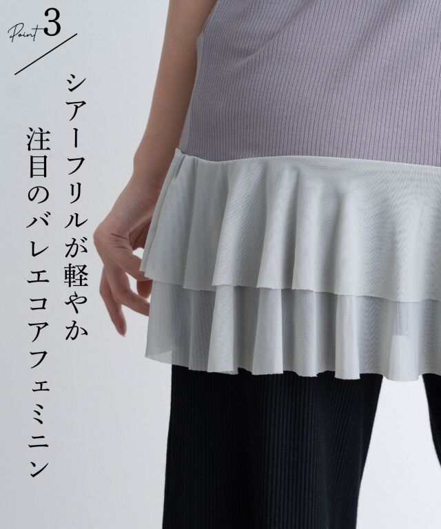 ほんのり透け感のあるシアーフリルが、女性らしさを引き立てるデザイン。