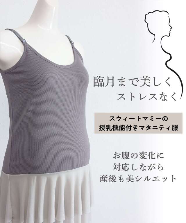 ほんのり透け感のあるシアーフリルが、女性らしさを引き立てるデザイン。抜群のストレッチ性で産前から産後まで長く着回せ、お腹まですっぽりと包み込みます。肩ひも調節、フロントオープン可能で授乳もラクちん。マタニティウェアと授乳服の通信販売スウィートマミーおすすめの産前産後長く着られる授乳キャミです。