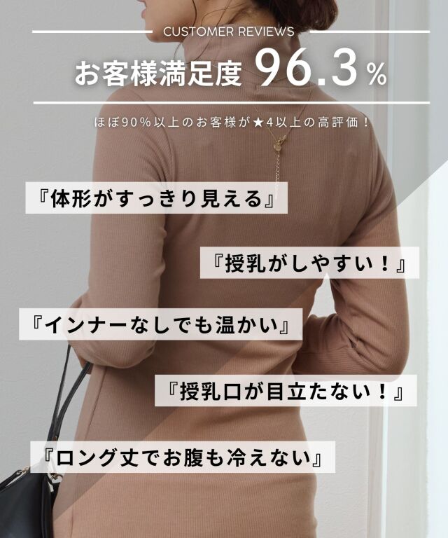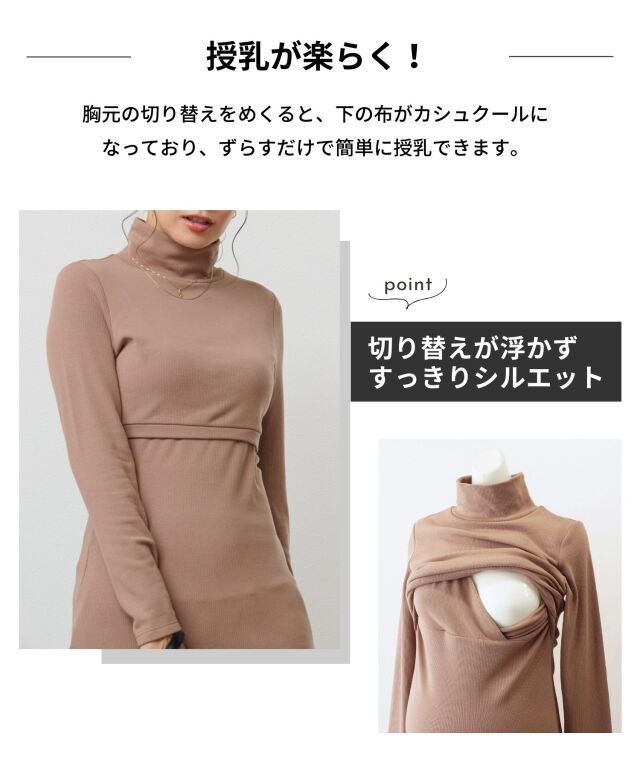 マタニティウェアと授乳服の通信販売スウィートマミーの人気授乳タートルネックはあったか裏起毛でシルエットがかわいいと口コミでも評判。授乳口が目立たず産前産後着られる授乳ハイネックはトレンドな丈長細見デザインでおしゃれカジュアルママにおすすめ。