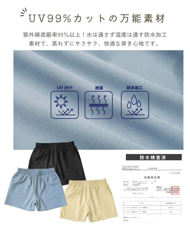 UV99%カットの万能素材!水は通さず湿気を通す防水加工素材で、蒸れずにさらさら、快適な穿き心地です。