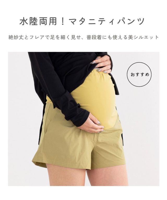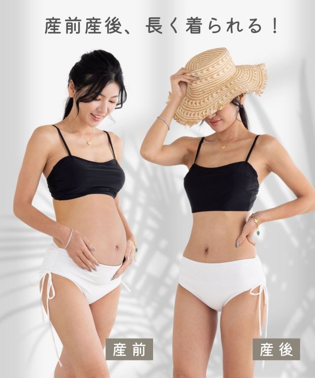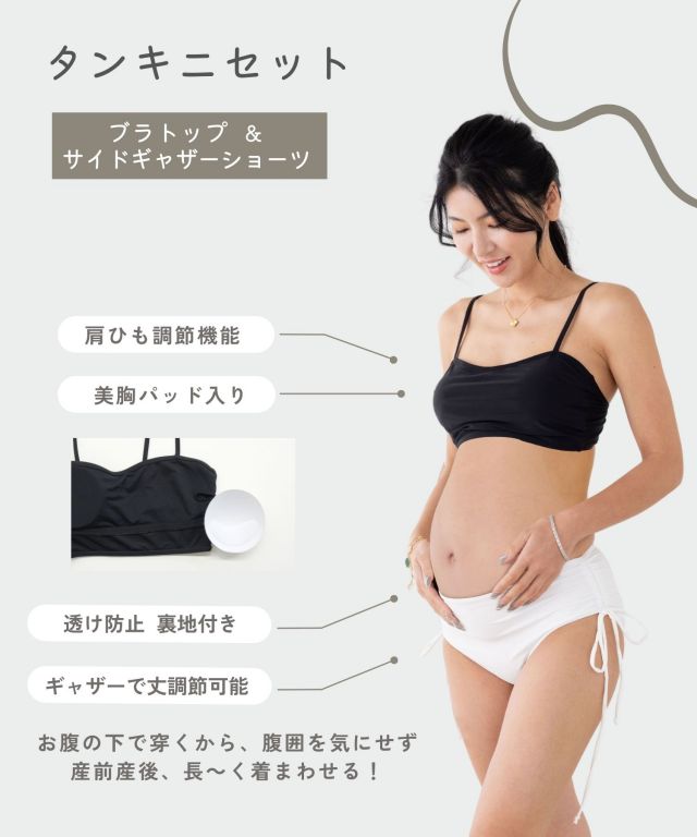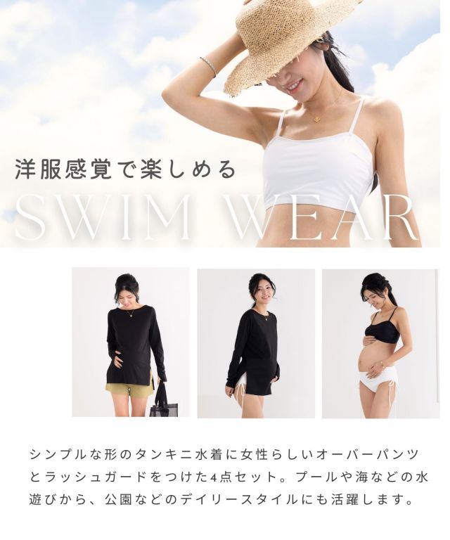 シンプルな形のタンキニ水着にリブ付きで楽に穿けるマタニティパンツとラッシュガードをつけた4点セット。プールや海などの水遊びから、公園などのデイリースタイルにも活躍します。紐ショーツはおなかの下で穿くから、腹囲を気にせず、産前から産後まで長く着まわせます。