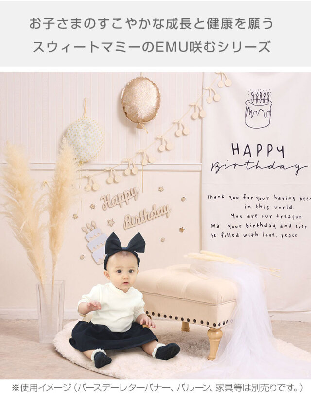 記念撮影にぴったり!優しい風合いの木製素材を使用したガーランドです。誕生日やイベントのお部屋のデコレーションにぴったり。お子さまのすこやかな成長と健康を願うスウィートマミーのEMU咲むシリーズからおすすめのアイテムです!