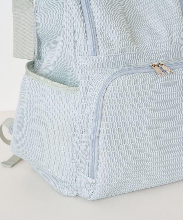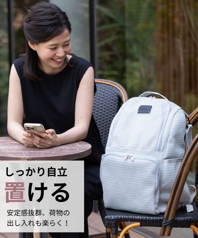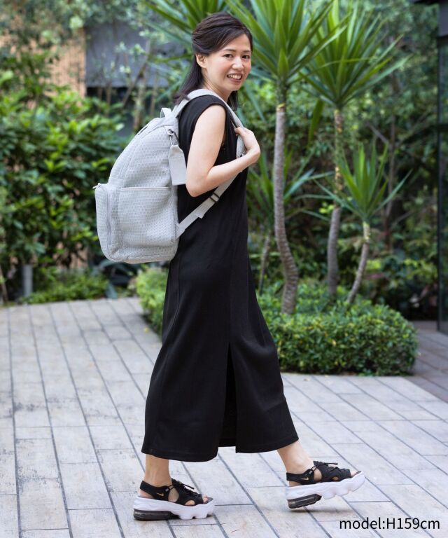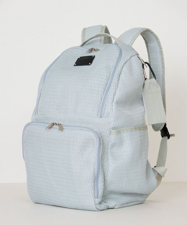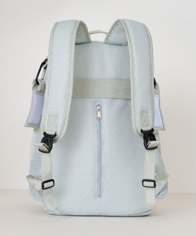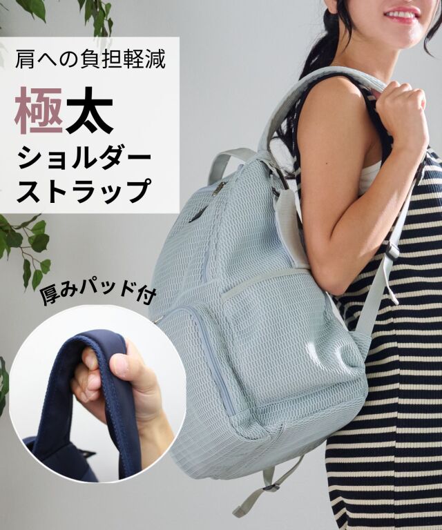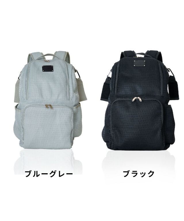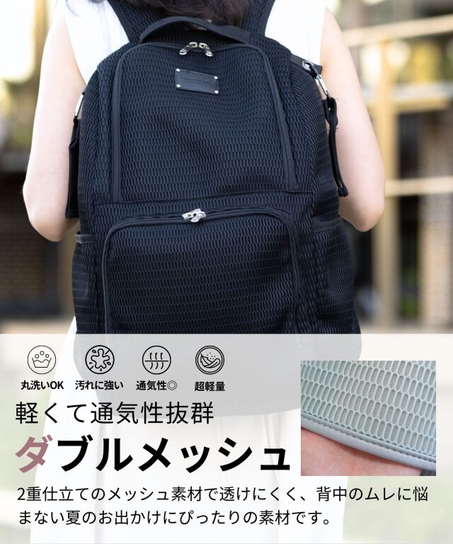 高密度メッシュ素材は通気性抜群で夏のお出掛けにぴったり。あのイヤな背中のムレに、もう悩みません。さらに丸洗いOK!
