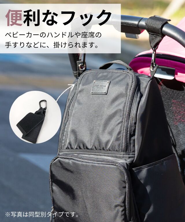 背中ファスナーがついておりリュックを降ろさなくても中身が取り出せて快適。ベビーカーフック付きで、おでかけ中もママの負担が減りストレスフリーです。