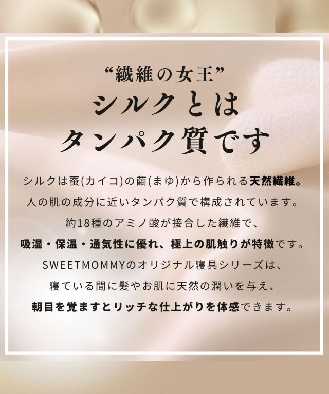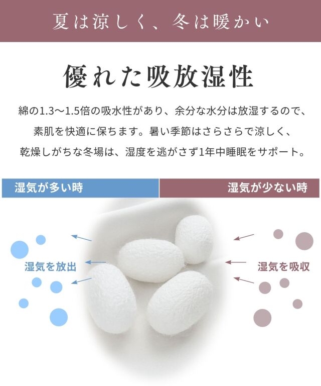 シルクの吸放湿性は暑い季節には蒸れにくく、乾燥している冬場には暖かく年中快適な睡眠に。