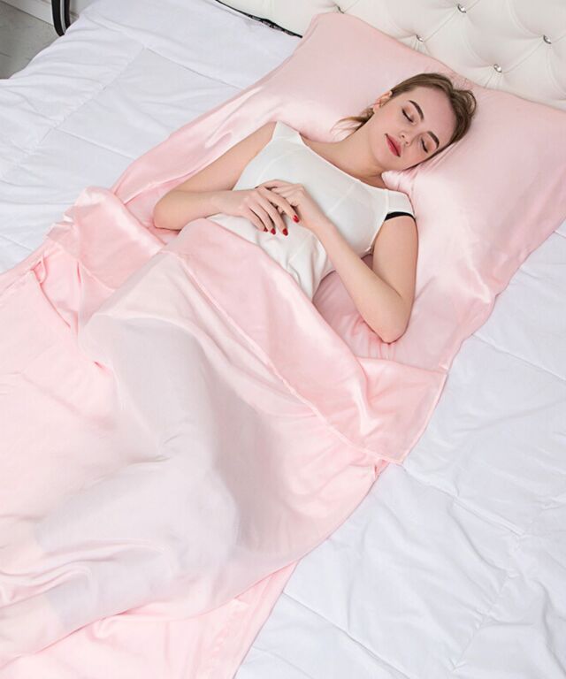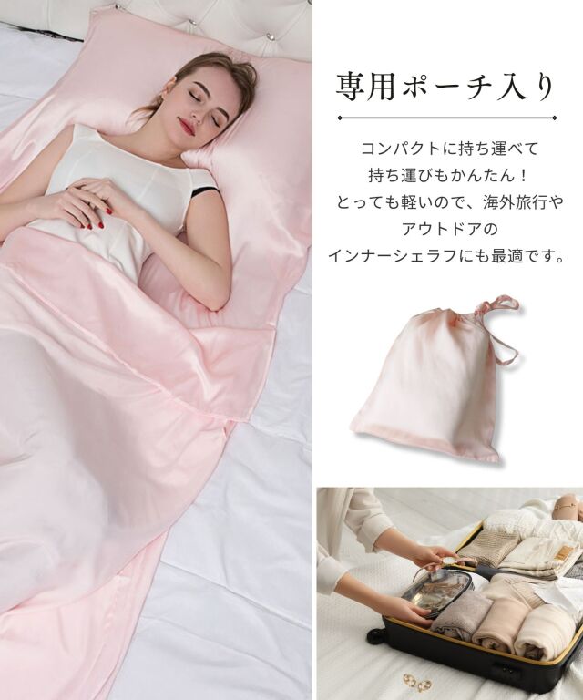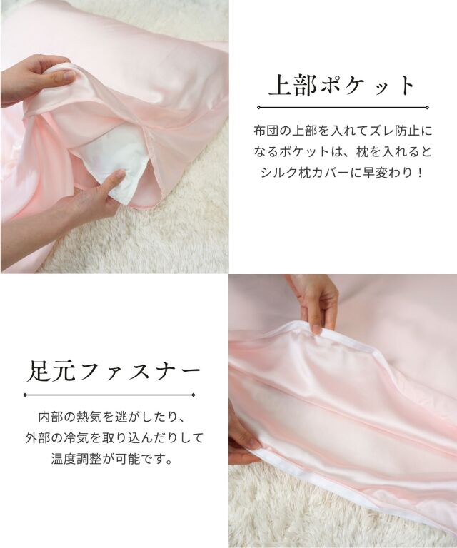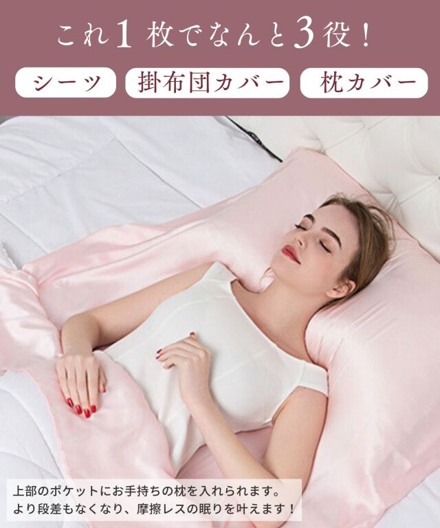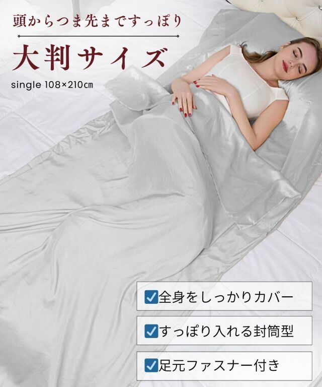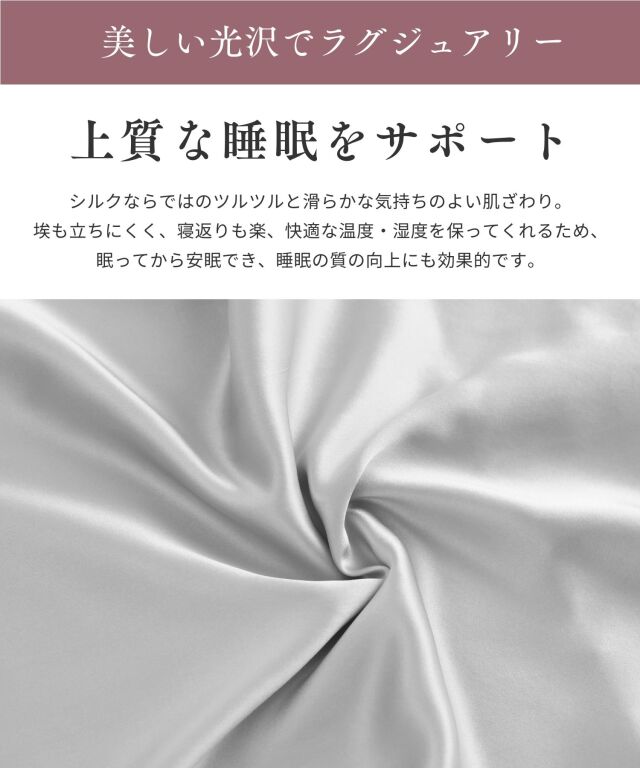 滑りが良く快適でラグジュアリーな眠りをお約束する、最高ランク6Aシルク100%のシーツです。 頭からつま先まで、すっぽりと包まれる封筒型。上部がポケット状になっており、これ1枚で枕カバー、シーツ、掛けカバーの3役になる優れもの。就寝時の摩擦や乾燥を軽減し、髪や素肌に負担をかけずうるおいを保ちます。 シルクの吸放湿性は暑い季節には蒸れにくく、乾燥している冬場には暖かく年中快適な睡眠に。 ホコリも立ちにくく、快適な温度・湿度を保ってくれるため睡眠の質の向上にもおすすめです。