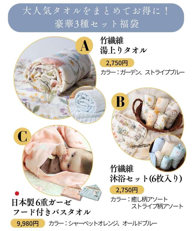 | 製品名: | 【2025福袋】6重ガーゼ ベビー バスタオルと沐浴セットが入る豪華3種セット |