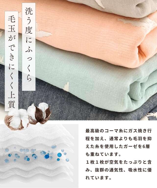 ふわっと軽い6重構造で、柔らかさ・弾力・通気性も抜群。乾きやすく、毎日快適に使えます。