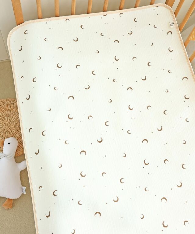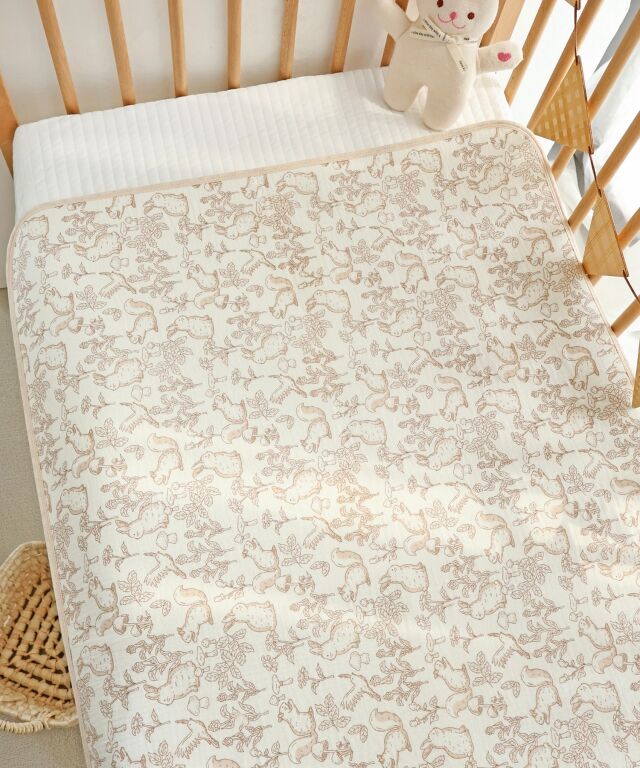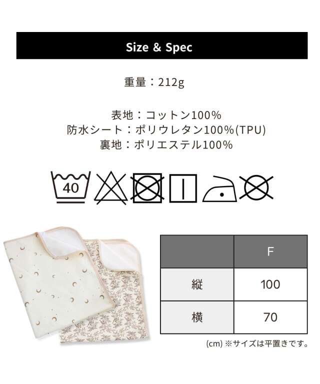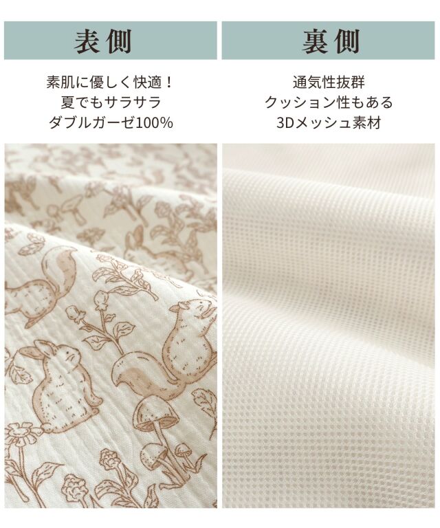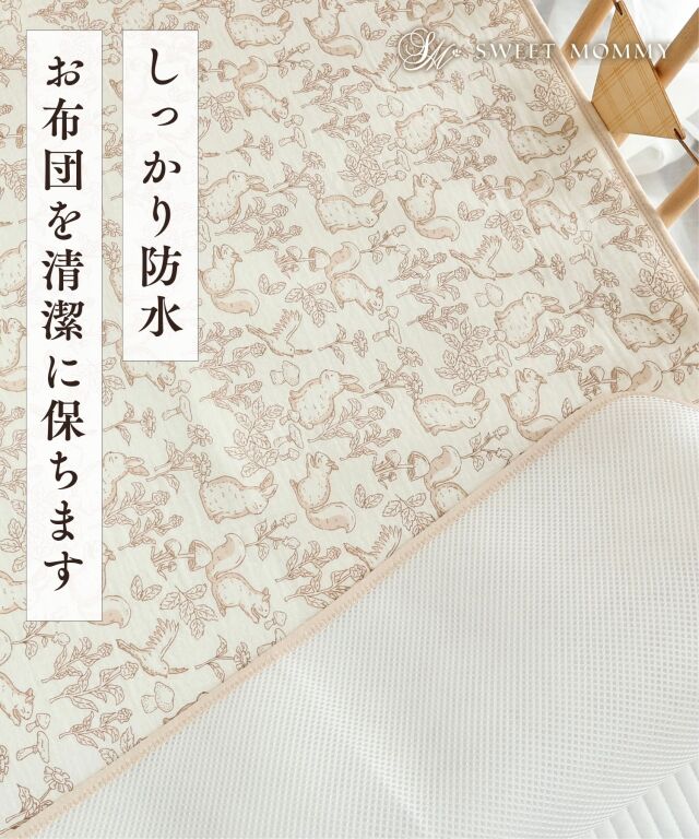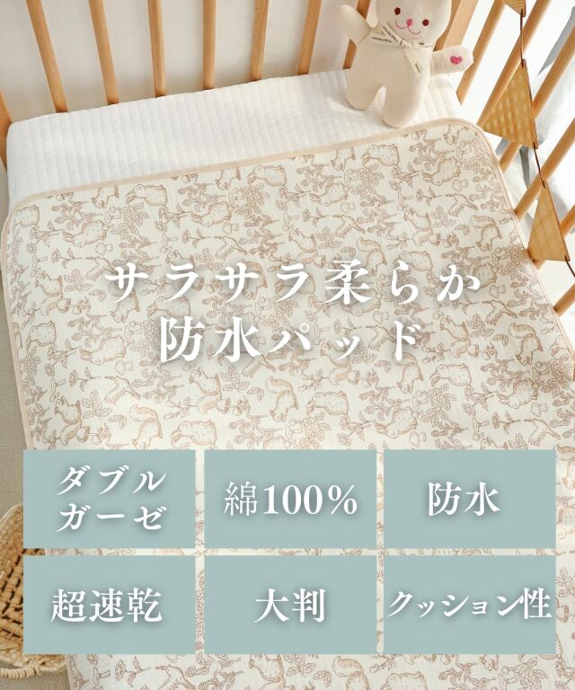 速乾性×吸水性に優れた最新のダブルガーゼ防水パッドです。 思わず写真を撮りたくなってしまうほどかわいいデザインはインテリアにも良く馴染みます。 素肌に優しいコットン100%のダブルガーゼで柔らかな肌触り。 画期的な3層構造で、水分を通さずしっかり防水、寝汗やオムツの漏れ、汚れから、お布団やベッドをしっかり守ります。 裏側はメッシュになっており、防水素材なのに嬉しい速乾。お洗濯にも安心です。 保育園やお昼寝にもピッタリ、ギフトにも喜ばれる逸品です。