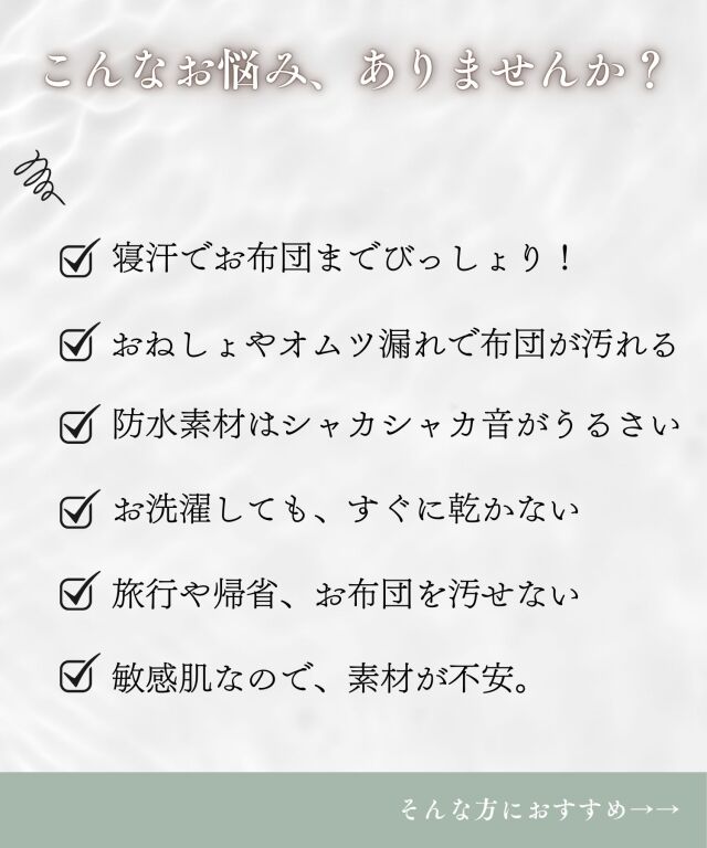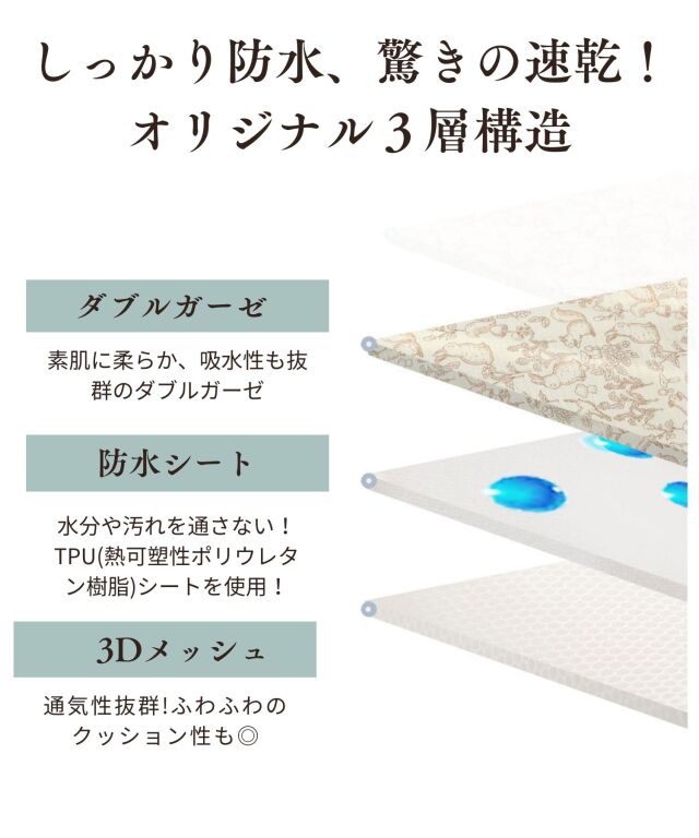 速乾性×吸水性に優れた最新のダブルガーゼ防水パッドです。