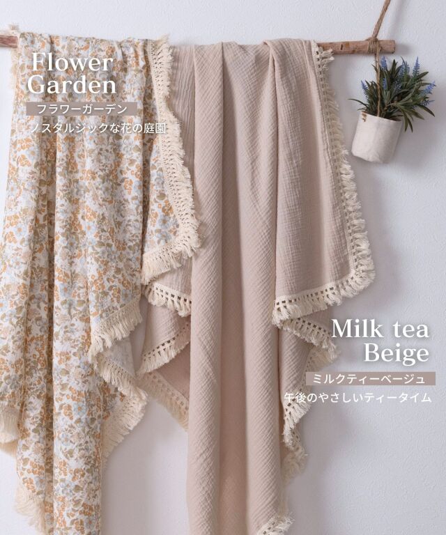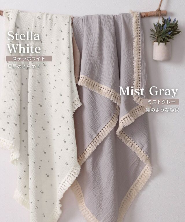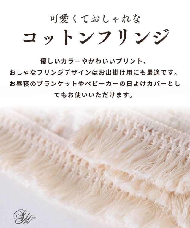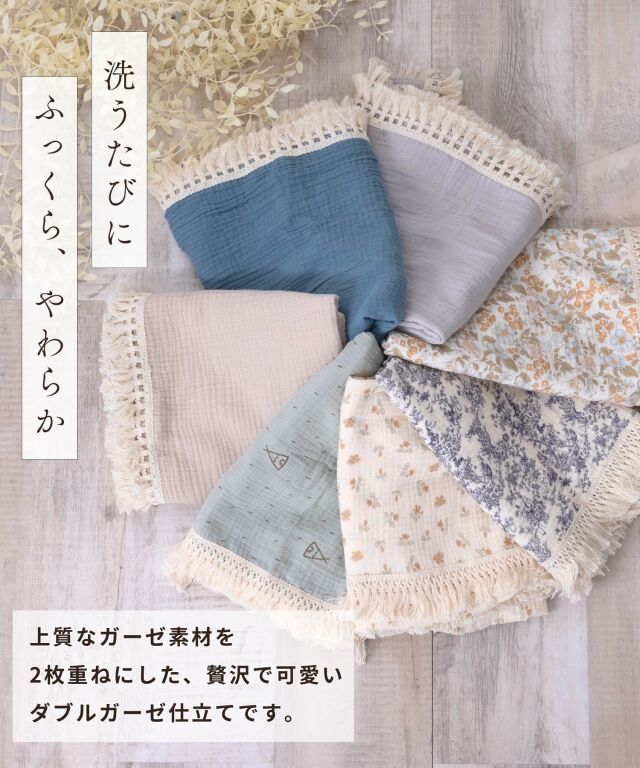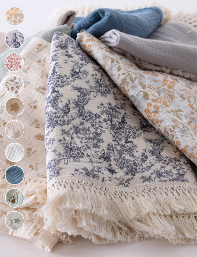 大切なお子様へ最初のプレゼントに。ふわっと優しい肌触りのコットン100%ダブルガーゼのベビーおくるみです。たっぷりのフリンジがおしゃれ。洗う度に柔らかく、ふんわり、通気性抜群で速乾性のあるダブルガーゼは、汗をさっと吸い取り、いつもサラサラ。おくるみに、ひざ掛けに、お出かけ時の日よけに。ニュアンスカラーのスウィートなデザインであらゆるシーンにお使い頂けます。