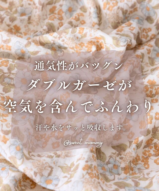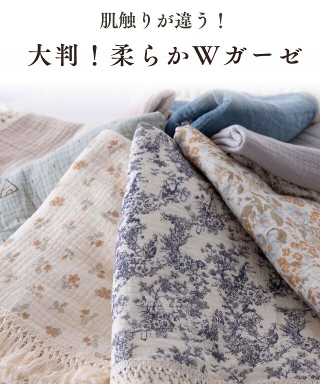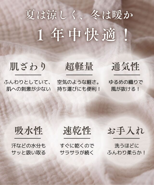 ふわっと優しい肌触り。洗う度に柔らかく、ふんわり、通気性抜群で速乾性のあるダブルガーゼは、汗をさっと吸い取り、夏でもサラサラの肌ざわり。