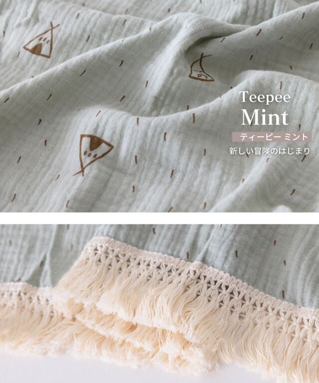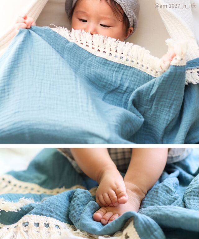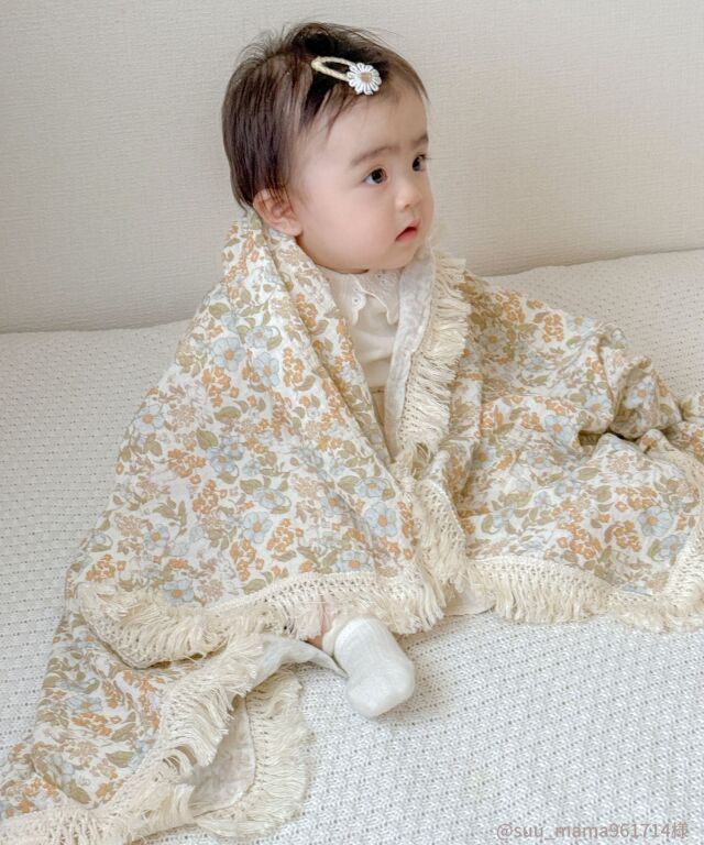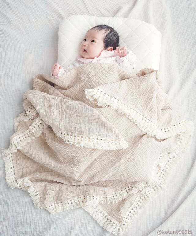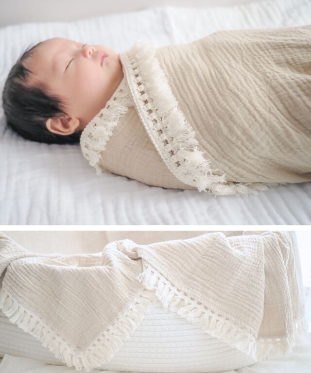 たっぷりのフリンジが可愛い、コットン100%ダブルガーゼのベビーおくるみです。