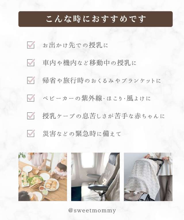 軽やか肌触りのよいコットン100%ダブルガーゼの授乳ケープです。 おしゃれを楽しみたいママにもぴったりのこだわりデザイン。 色々な用途に使えるマルチユースアイテムだから、出産祝いにも◎。 マタニティウェアと授乳服の通信販売スウィートマミーおすすめのおしゃれな授乳ケープです。