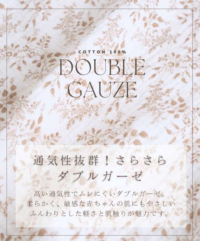 通気性のよいダブルガーゼはケープ内に熱がこもりにくく、敏感肌の赤ちゃんの肌にも優しいふんわりと軽い肌触りです。