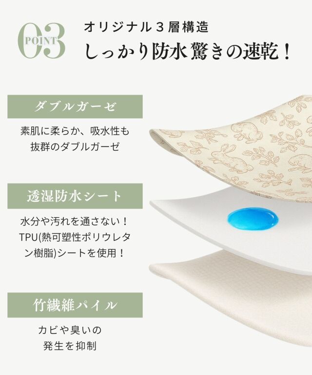 画期的な3層構造で、水分を通さずしっかり防水、寝汗やオムツの漏れ、吐き戻しなどの汚れから、お布団やベッドをしっかり守ります。