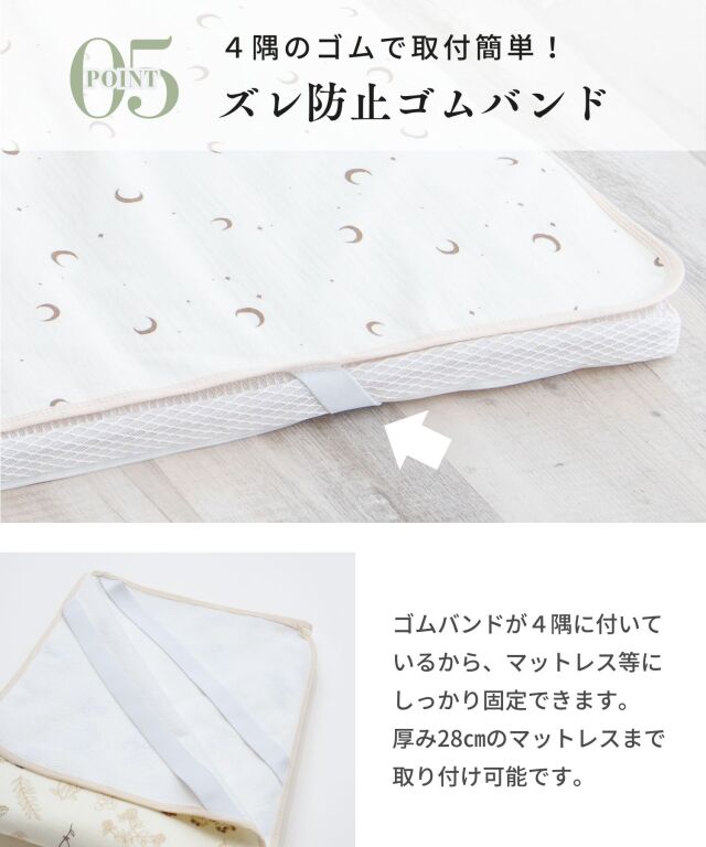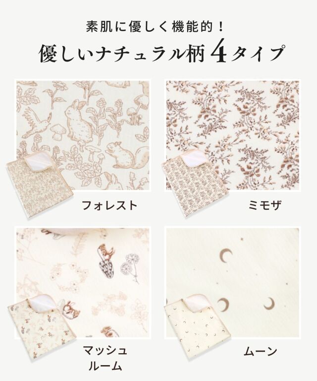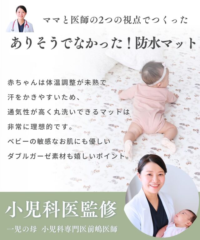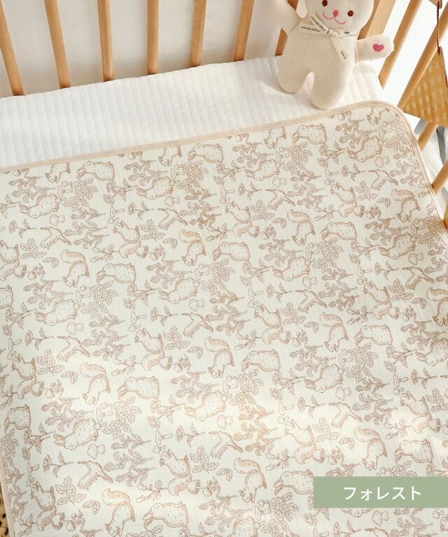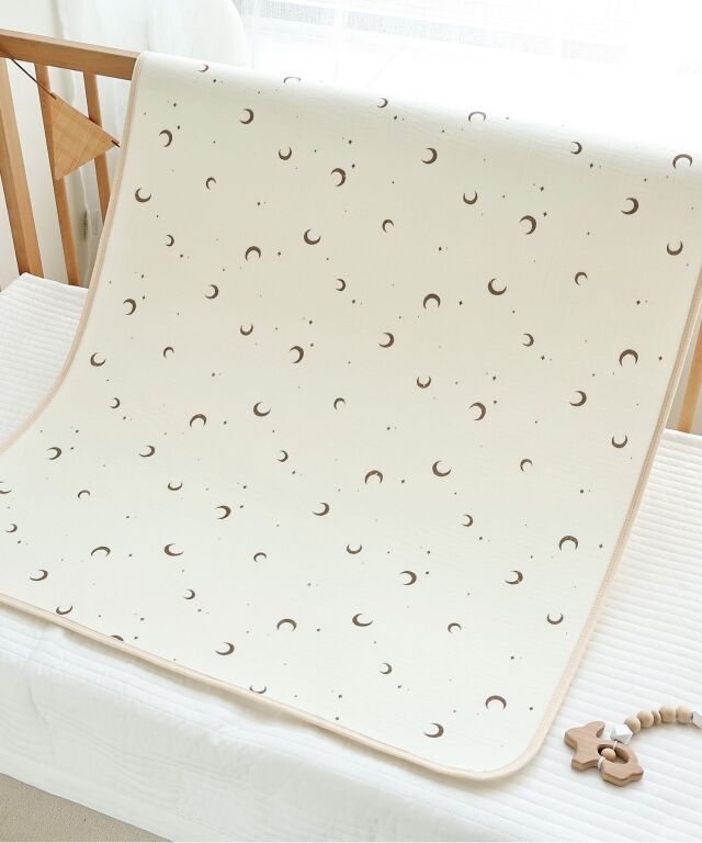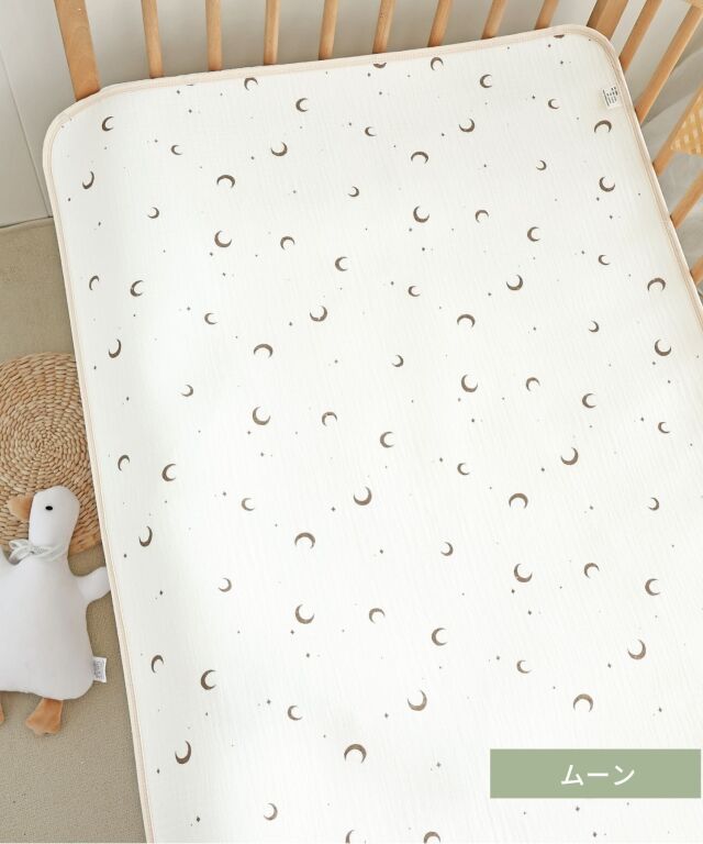 速乾性×吸水性に優れた最新のダブルガーゼ防水パッドです。思わず写真を撮りたくなってしまうほどかわいいデザインはインテリアにも良く馴染みます。素肌に優しいコットン100%のダブルガーゼで柔らかな肌触り。画期的な3層構造で、水分を通さずしっかり防水、寝汗やオムツの漏れ、汚れから、お布団やベッドをしっかり守ります。裏側は竹繊維パイル地になっており、防水素材なのに嬉しい速乾。お洗濯にも安心です。保育園やお昼寝にもピッタリ、ギフトにも喜ばれる逸品です。