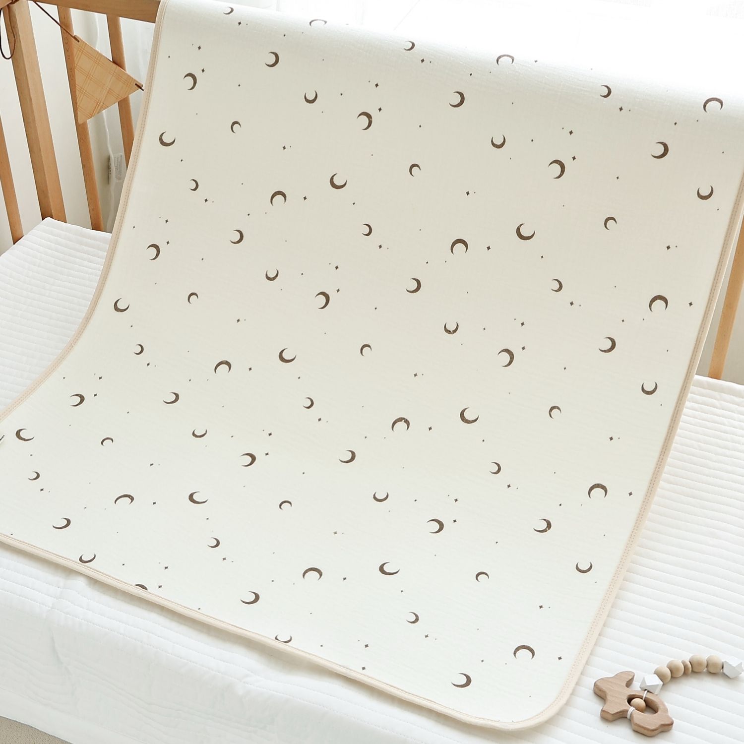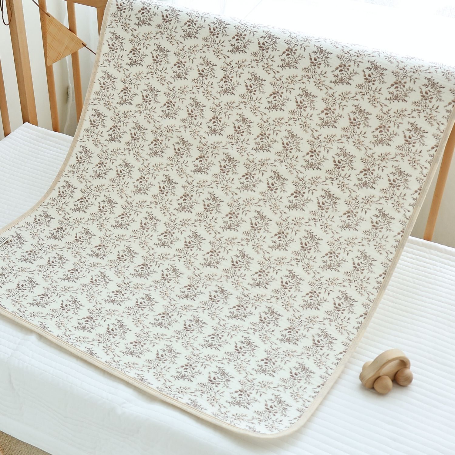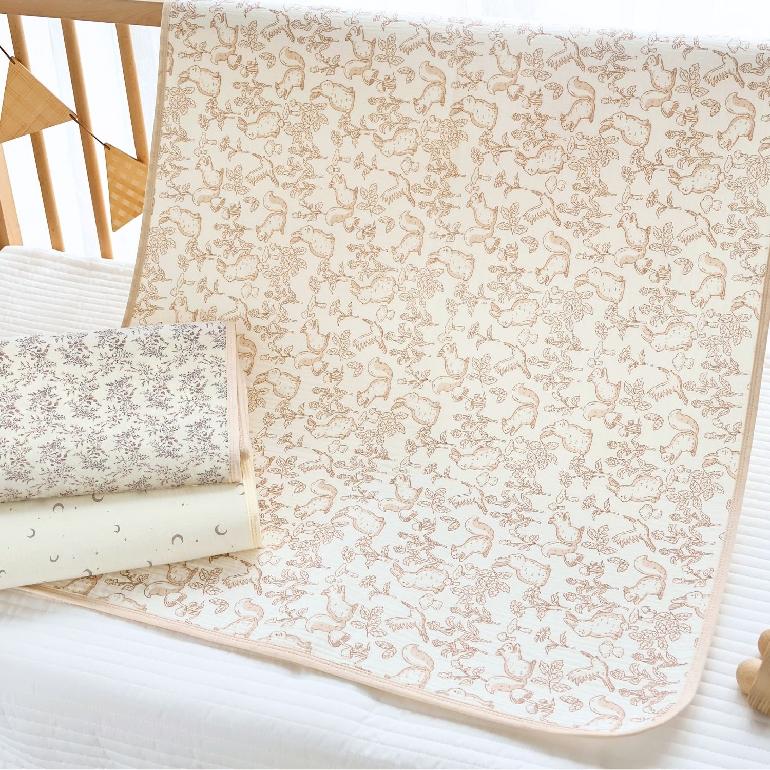 速乾性×吸水性に優れた最新のダブルガーゼ防水パッドです。思わず写真を撮りたくなってしまうほどかわいいデザインはインテリアにも良く馴染みます。素肌に優しいコットン100%のダブルガーゼで柔らかな肌触り。画期的な3層構造で、水分を通さずしっかり防水、寝汗やオムツの漏れ、汚れから、お布団やベッドをしっかり守ります。裏側は竹繊維パイル地になっており、防水素材なのに嬉しい速乾。お洗濯にも安心です。保育園やお昼寝にもピッタリ、ギフトにも喜ばれる逸品です。