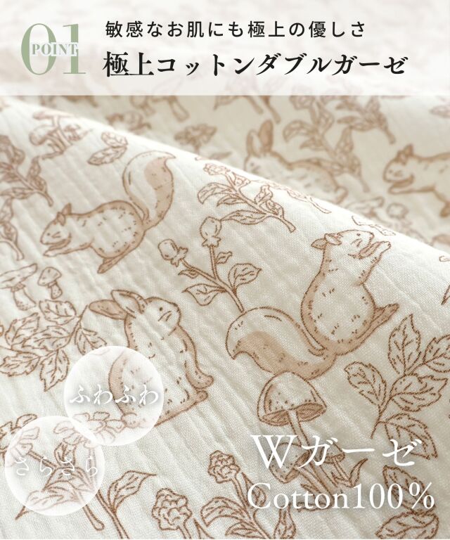 素肌に優しいコットン100%のダブルガーゼで柔らかな肌触り。