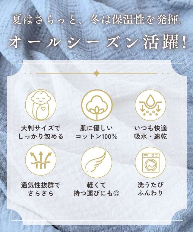 さらっと心地よい、コットン100%のダブルガーゼ素材を使用したベビーおくるみです。洗うたびに柔らかく、ふんわりとした肌ざわりに。通気性と速乾性に優れ、汗をすばやく吸収して、夏でもさらさら快適です。ナチュラルで可愛い柄と、インテリアに馴染むおしゃれなカラーも魅力。大判サイズなので、おくるみはもちろん、お昼寝ケットやひざ掛け、日よけなどマルチに活躍します。おしゃれなレース柄のジッパー袋入りで、出産祝いやギフトにもぴったりです。