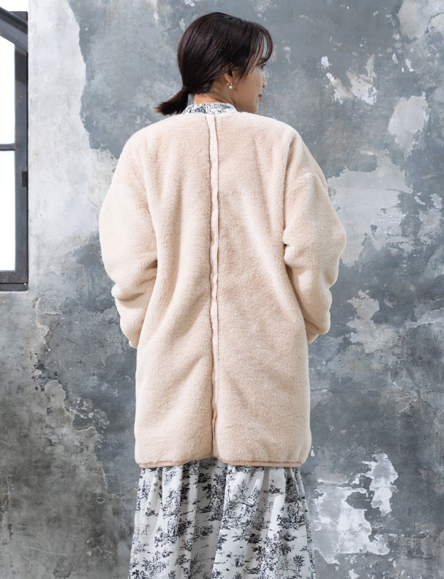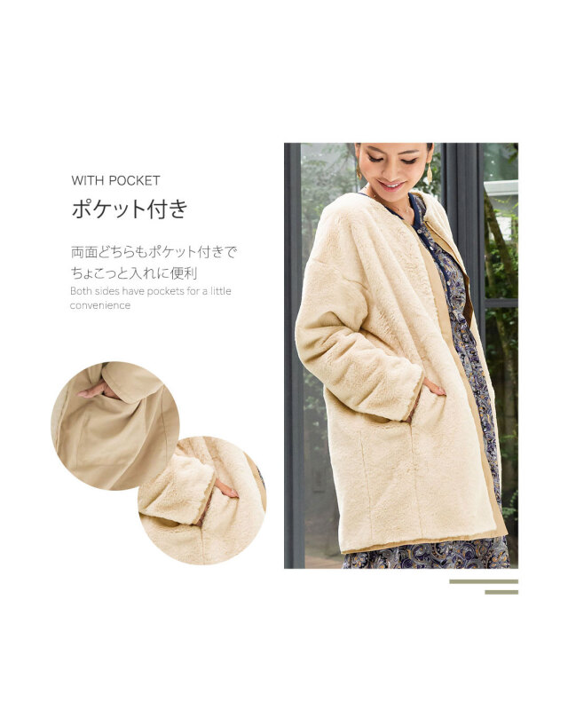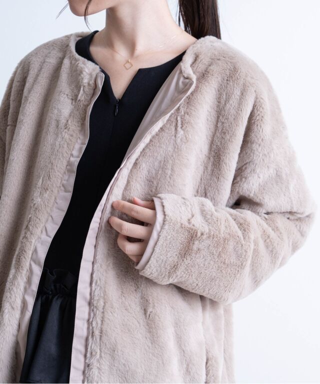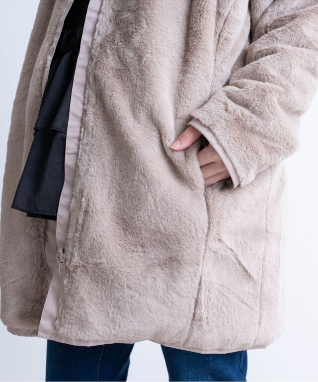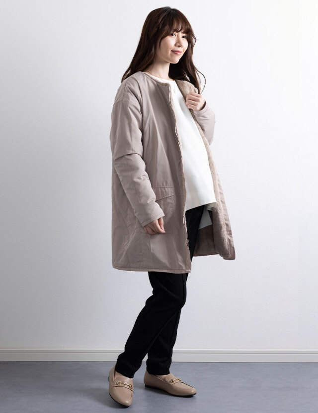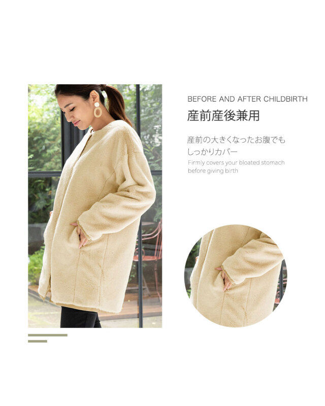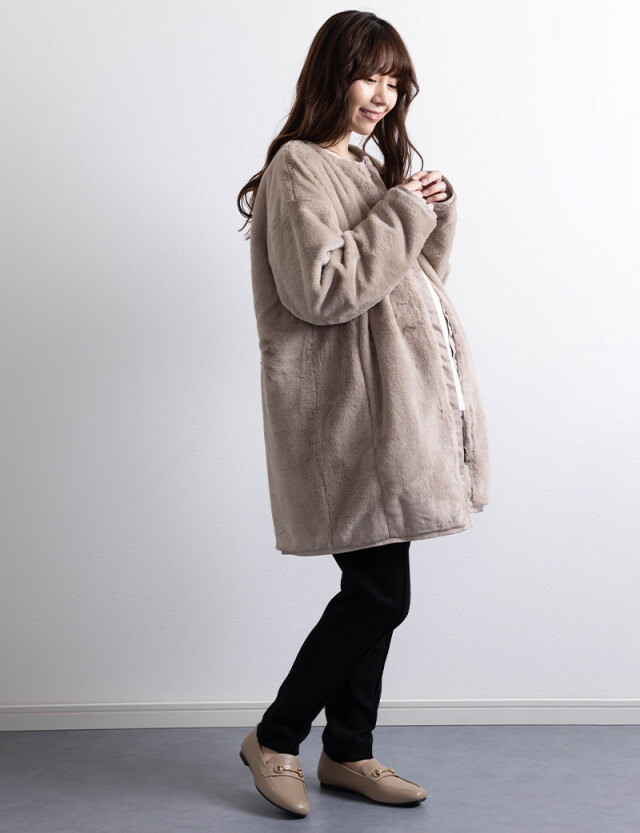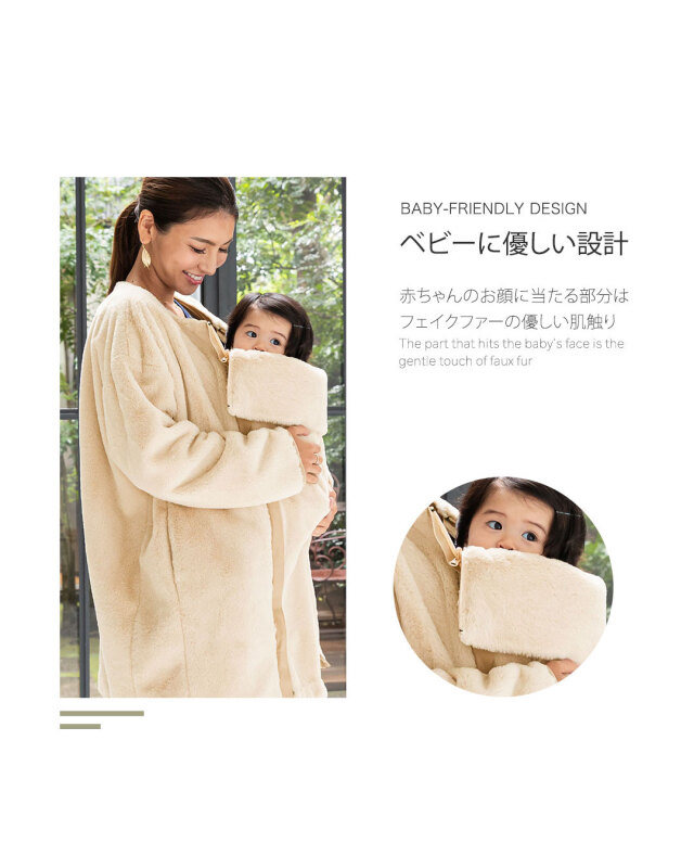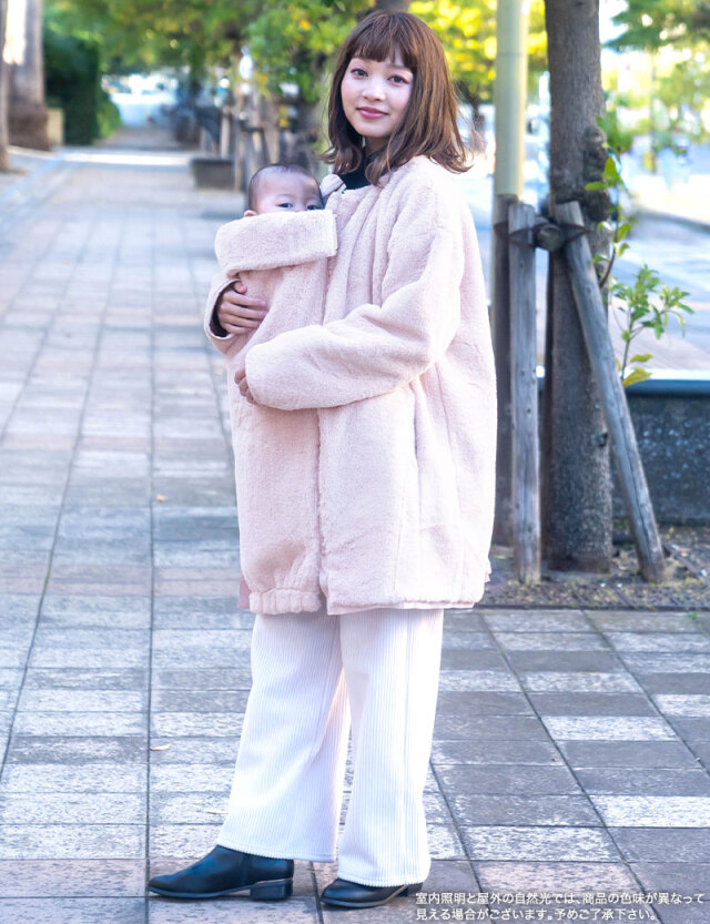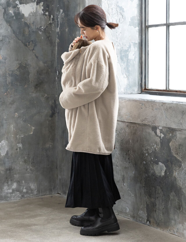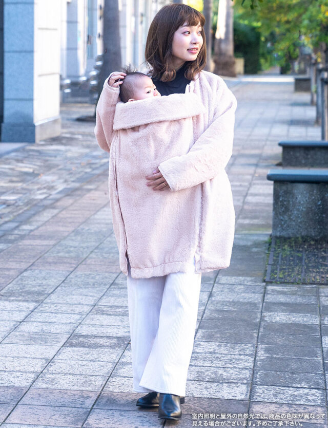大人可愛いフェイクファー×上品なポリエステル素材のリバーシブルママコートです。ダッカー付きで抱っこ・おんぶにも対応。これ1枚で産前産後ずっと、様々なシーンで活躍してくれる優秀アイテムです。授乳服とマタニティウェアの通販専門店スウィートマミー本店。