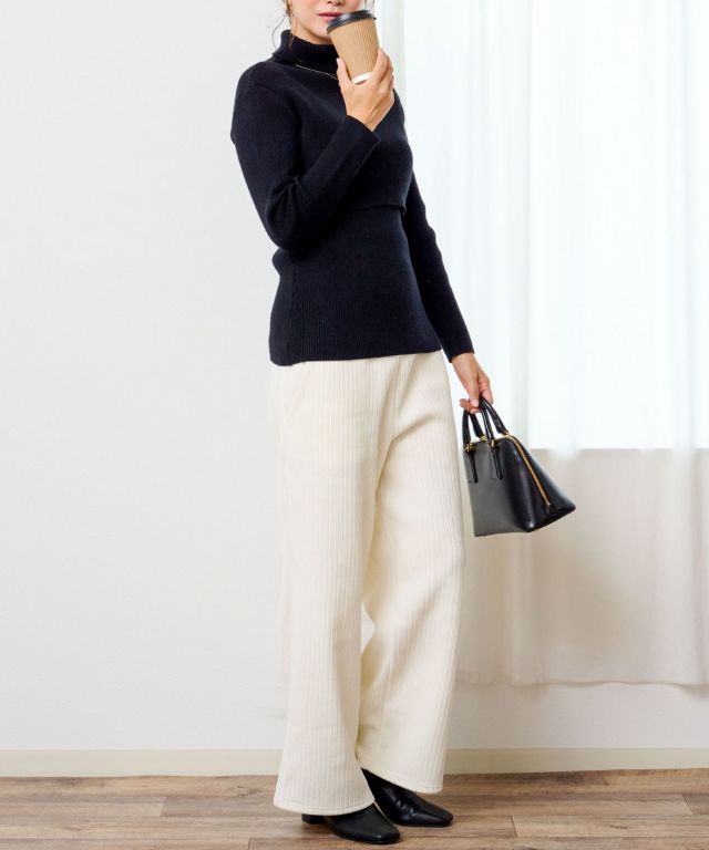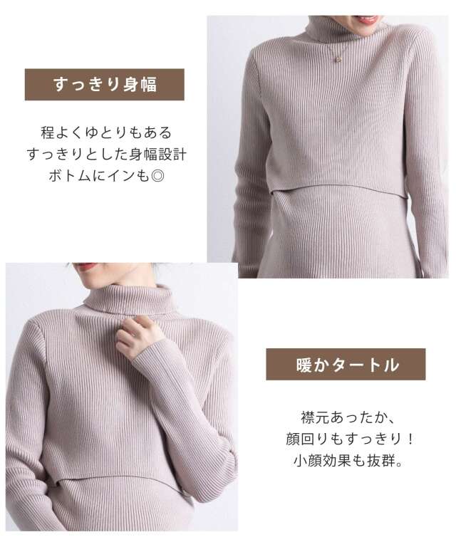 着るだけで決まる、上品ニットセーター。しっかりと肉厚で暖かく、1枚で着られるタートルネックニット。ニットの前身頃が二重仕立てなので、めくりあげて授乳可能。お腹が守られていて寒い時期の授乳も辛くなりません。伸縮性のよいリブ編みで妊娠中から長くお使いいただけます。