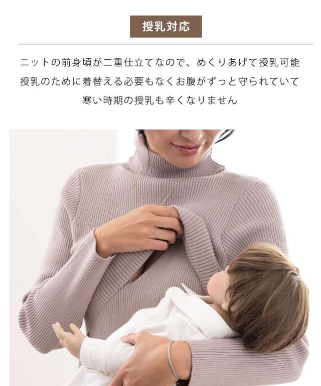 ニットの前身頃が二重仕立てなので、めくりあげて授乳可能。お腹が守られていて寒い時期の授乳も辛くなりません。
