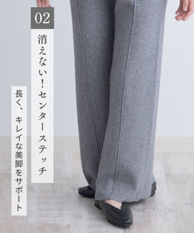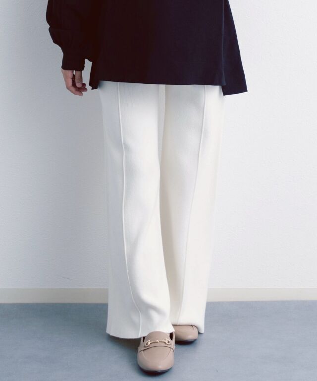 ワイドな裾幅が体型カバーにも優れ、ピンタックにした消えないセンタープレスが脚長&美脚に魅せます。