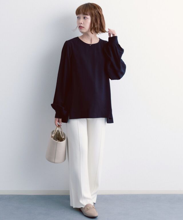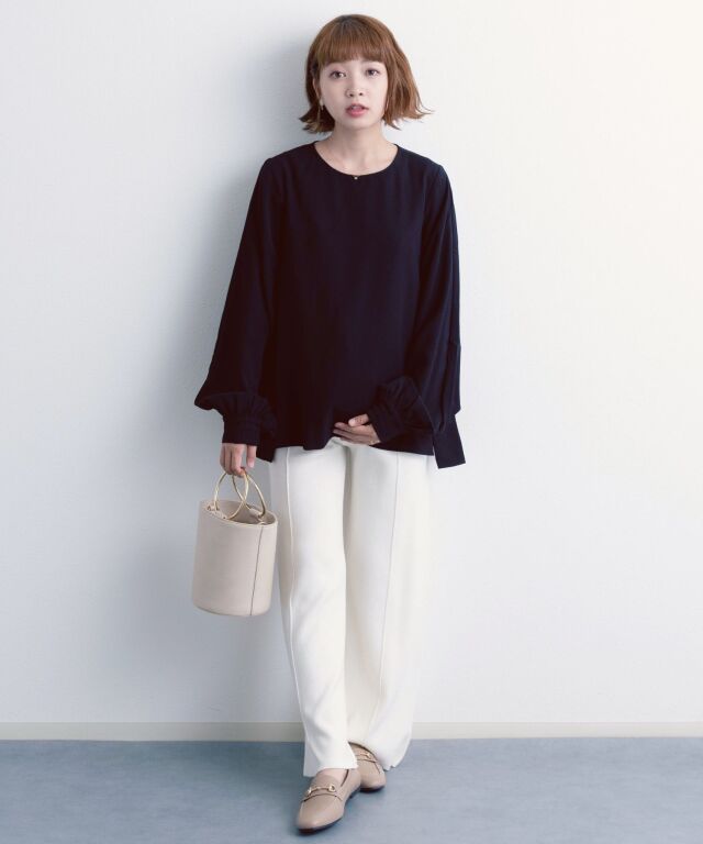 ブラウスとのスタイリングできれいめな着こなしがおすすめ。
