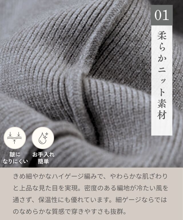 きめ細やかなハイゲージ編みで、やわらかな肌ざわりと上品な見た目を実現。