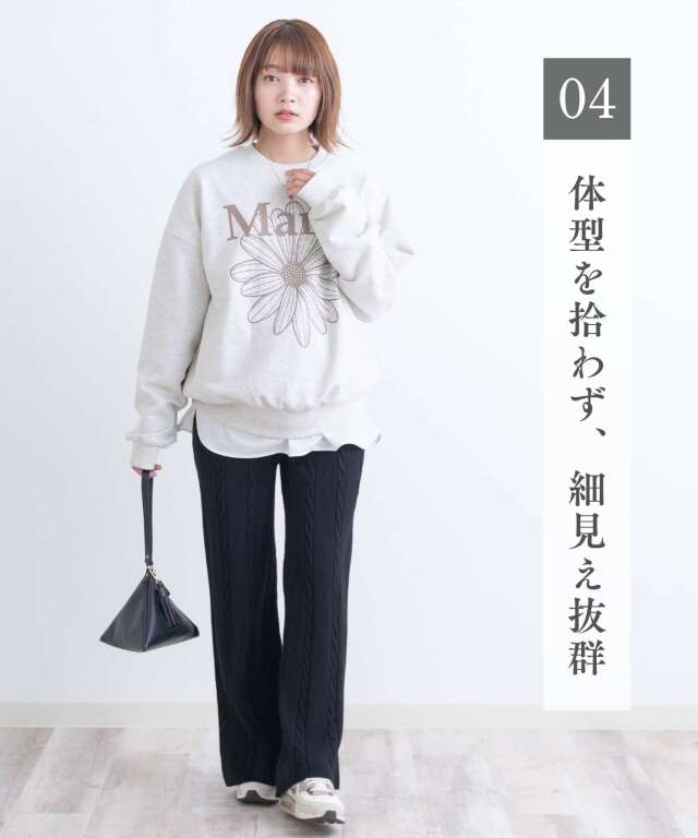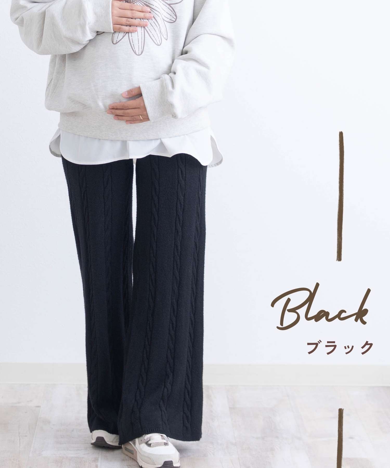 立体感のあるケーブル編みが目を引くニットパンツです。縦ラインの編地ですっきり見え、はくだけで上品な印象に。素材はチクチクしない柔らかな肌触りで、はいた瞬間から心地よさを実感。しっかり伸びて臨月まで快適に着用でき、すとんと落ちるシルエットが脚のラインを拾わず美脚見えを叶えます。シンプルなトップスと合わせるだけで、おしゃれなカジュアルコーデが完成。快適さとおしゃれを両立させるアイテムです。