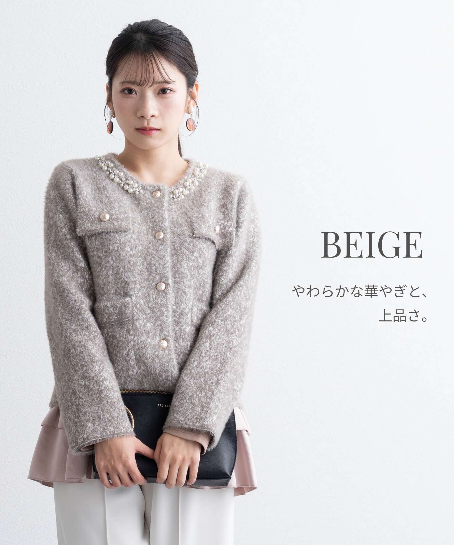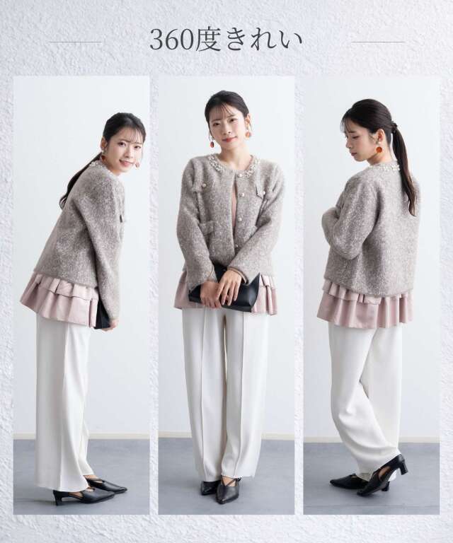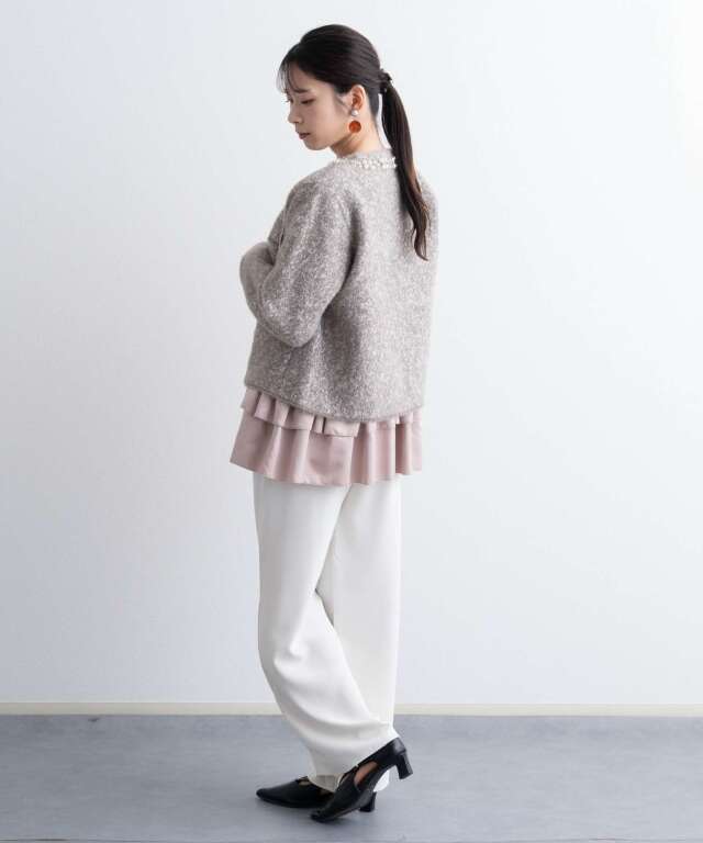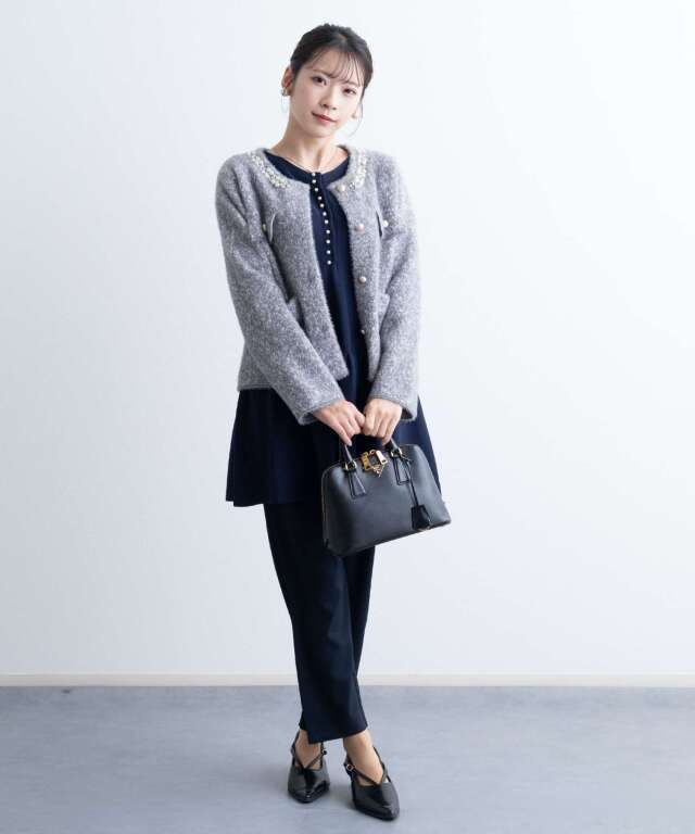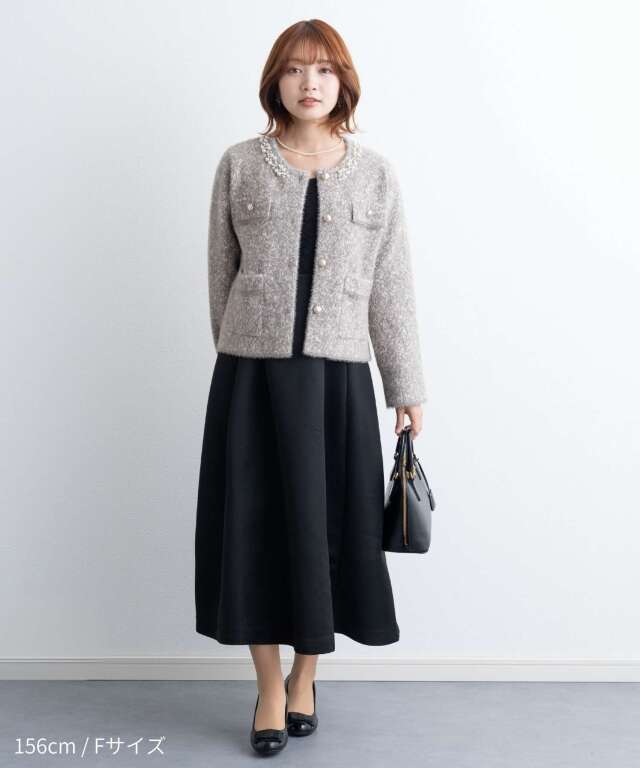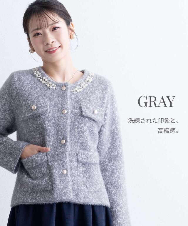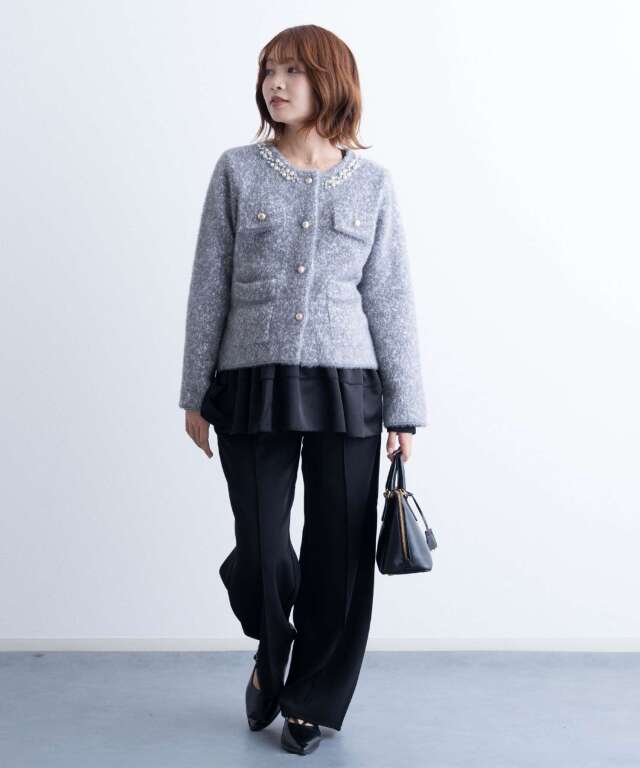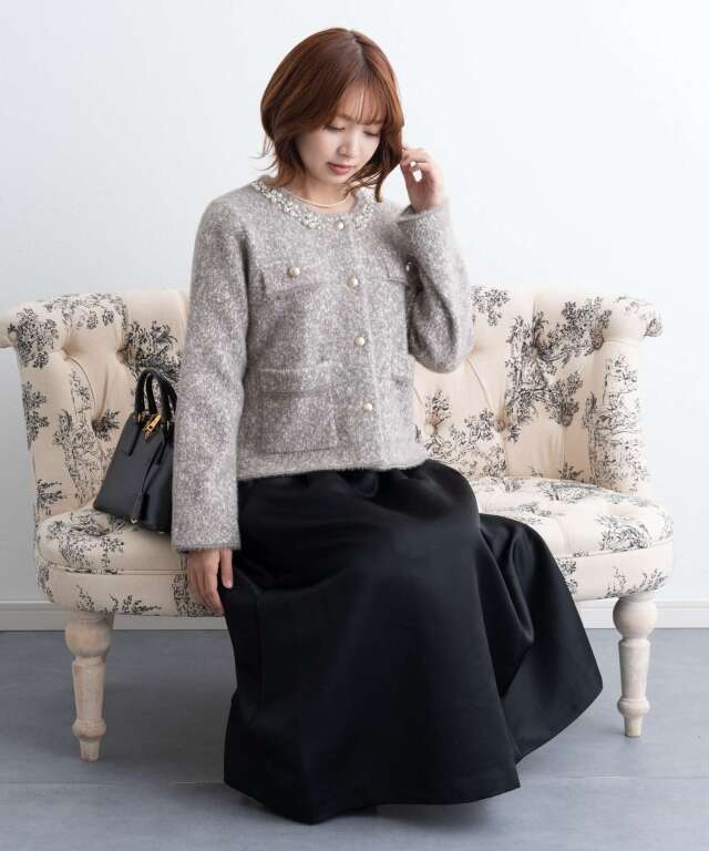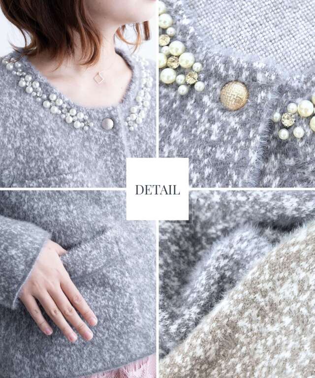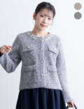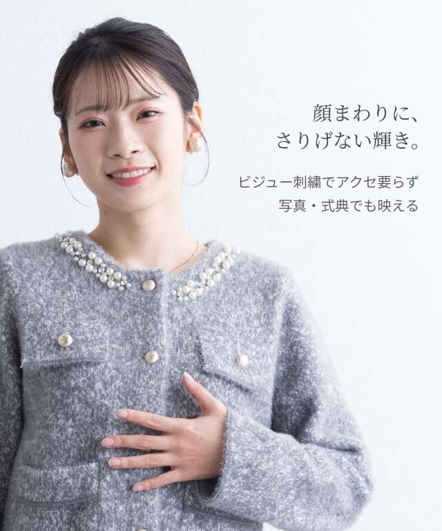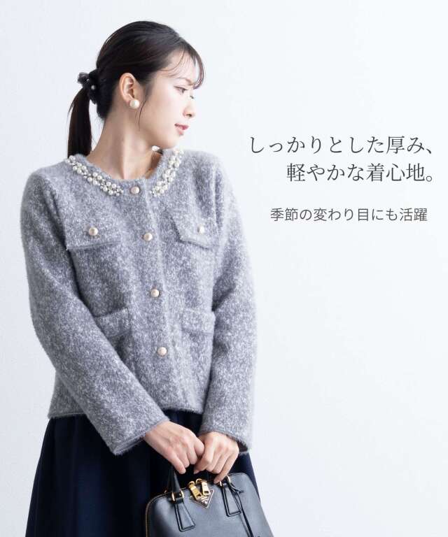 ビジューをあしらった襟元が、さりげなく華やぐニットジャケット。