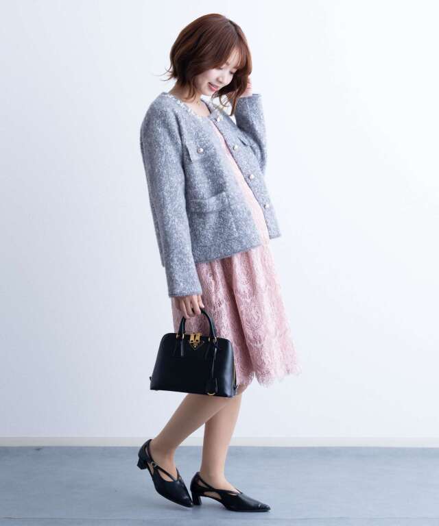 ビジューをあしらった襟元が、さりげなく華やぐニットジャケット。柔らかくふんわりとした編み地で、軽やかな着心地ながら上品な存在感を演出します。コンパクトすぎない絶妙なシルエットで、妊娠中のお腹にもやさしく寄り添い、締め付け感なく着用いただけます。フロントボタンとポケットデザインがきちんと感をプラスし、ON/OFF問わず活躍。羽織るだけでコーディネートが整う一枚です。