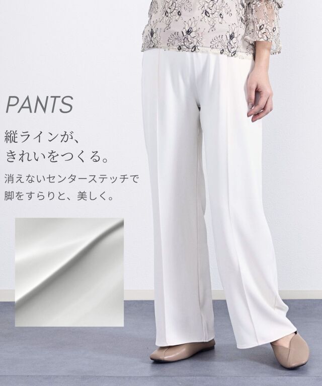 ワイドな裾幅が体型カバーにも優れ、ピンタックにした消えないセンタープレスが脚長&美脚に魅せます。