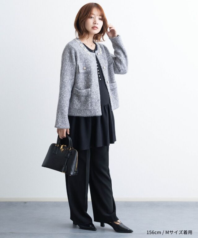 ビジューをあしらった襟元が、さりげなく華やぐニットジャケット。柔らかくふんわりとした編み地で、軽やかな着心地ながら上品な存在感を演出します。コンパクトすぎない絶妙なシルエットで、妊娠中のお腹にもやさしく寄り添い、締め付け感なく着用いただけます。フロントボタンとポケットデザインがきちんと感をプラスし、ON/OFF問わず活躍。羽織るだけでコーディネートが整う一枚です。