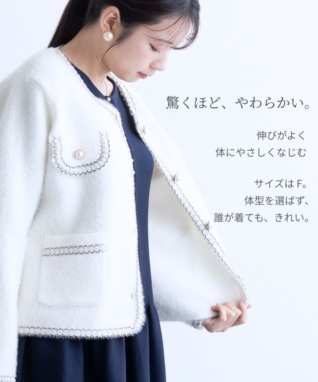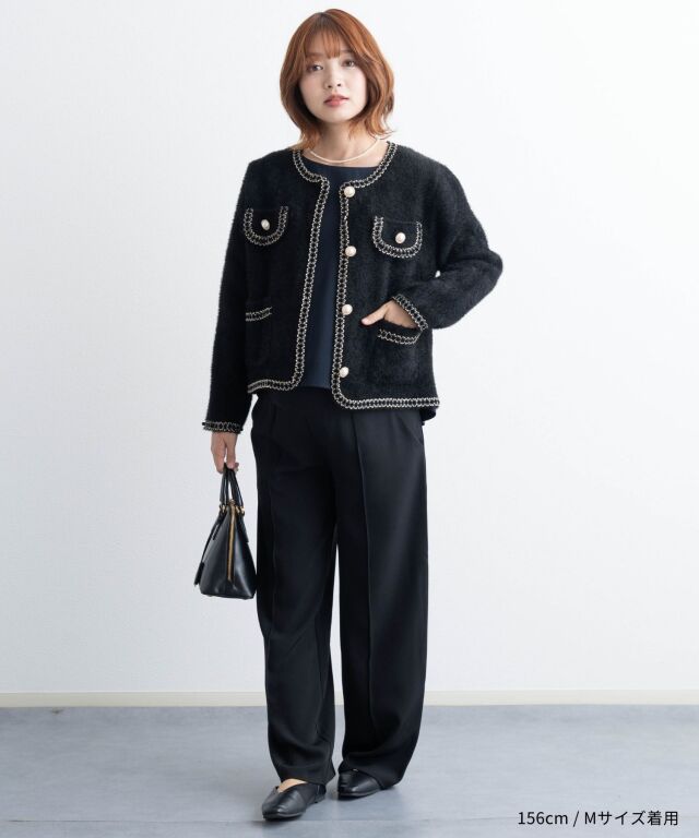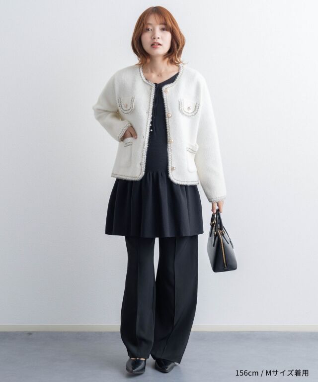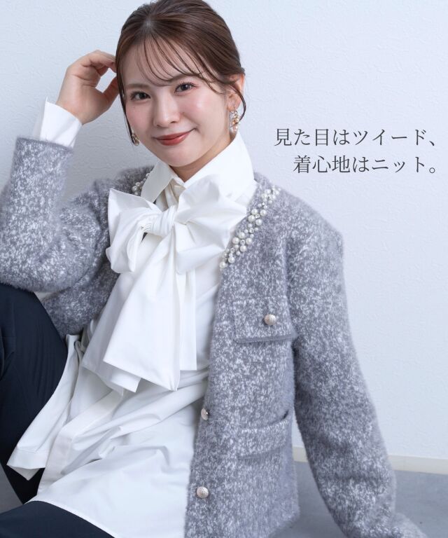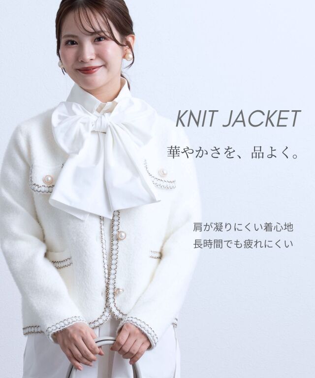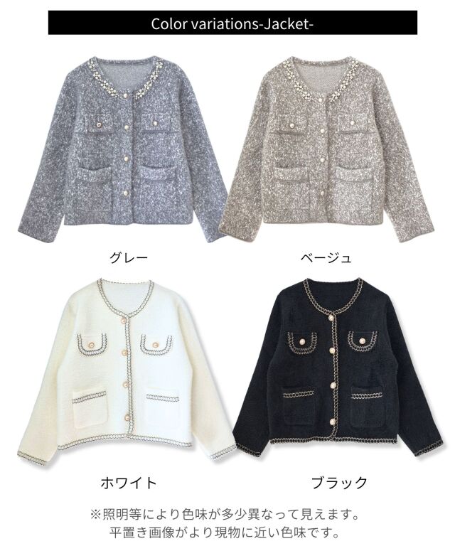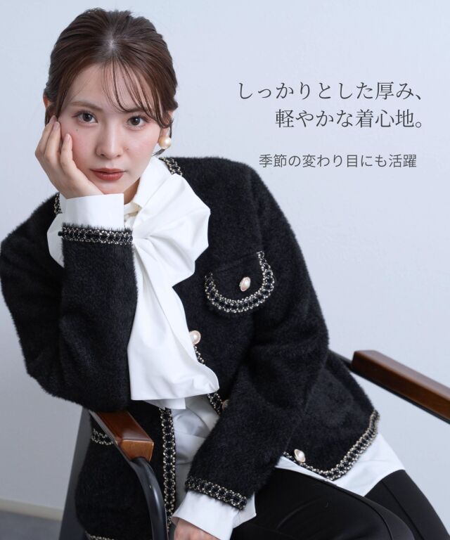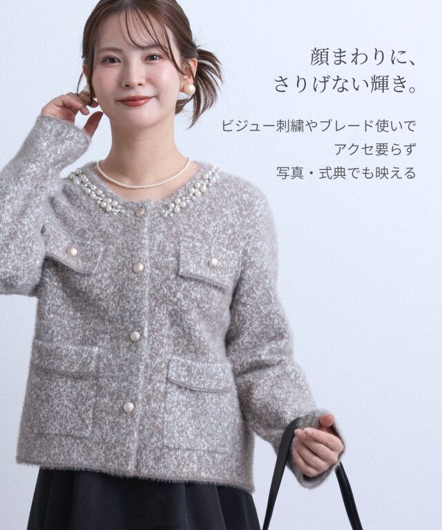 ビジューやブレードをあしらった襟元が、華やぐニットジャケットと、