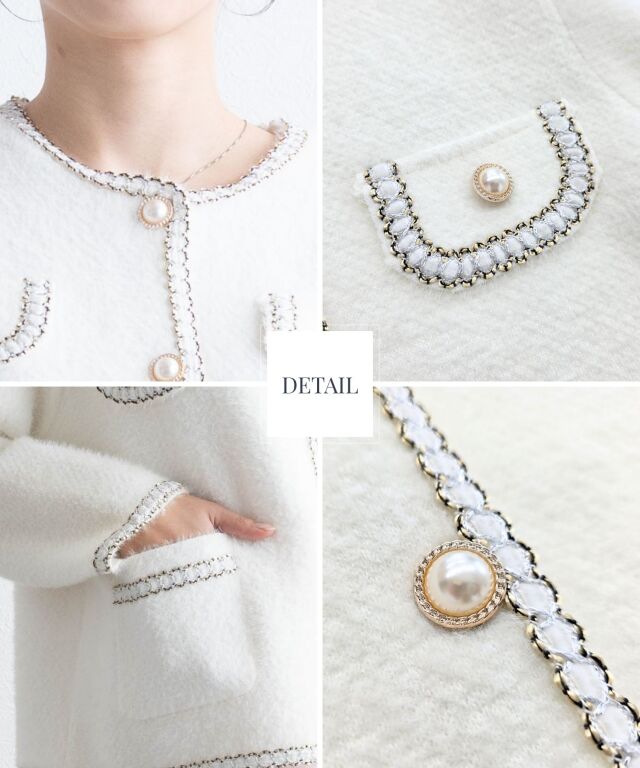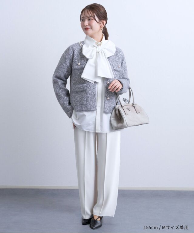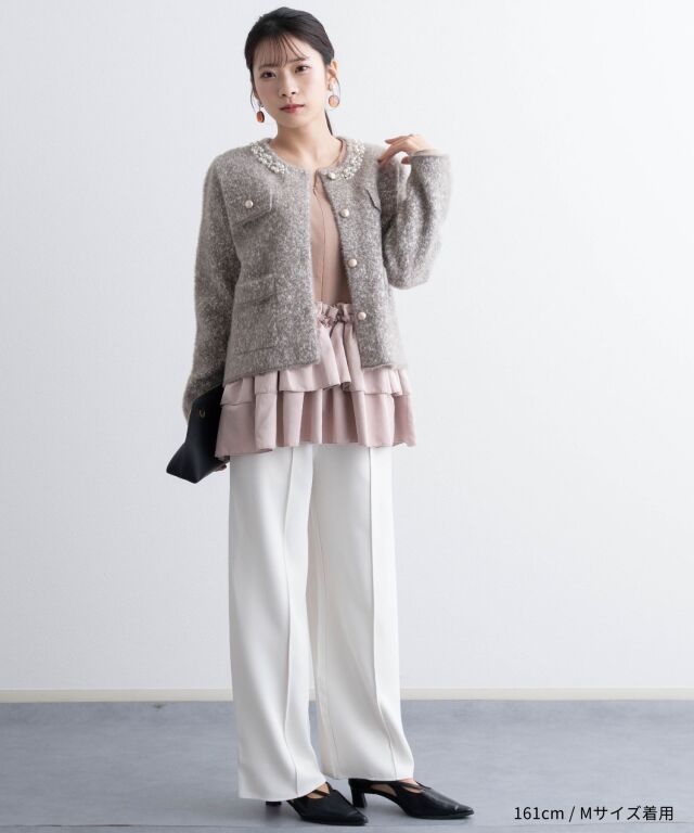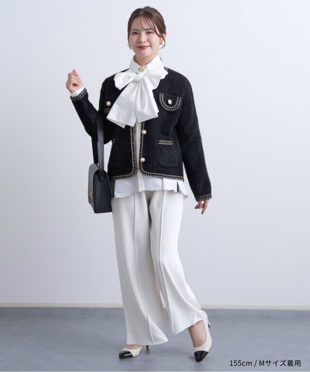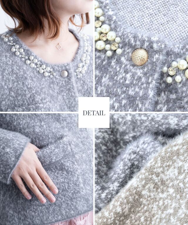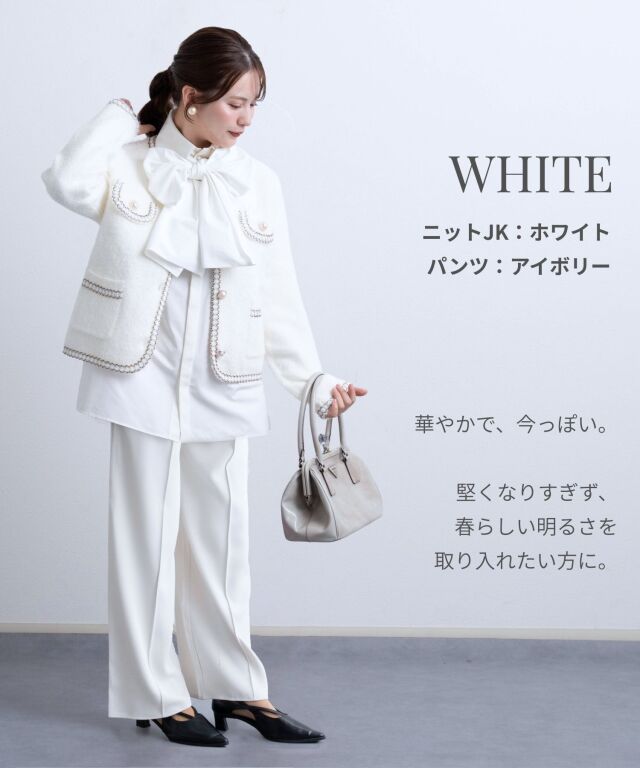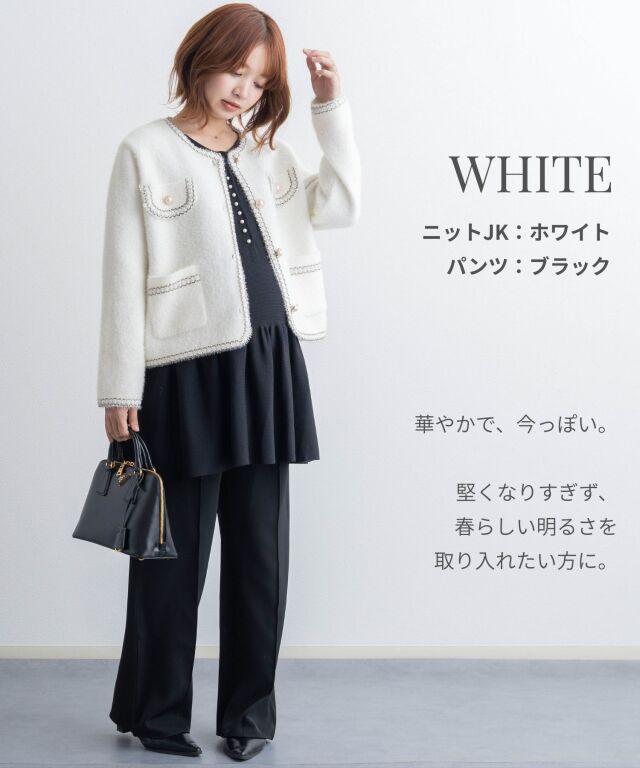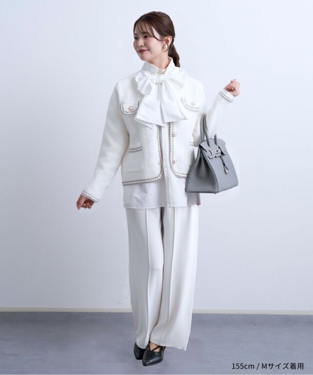 ビジューやブレードをあしらった襟元が、華やぐニットジャケットと、
