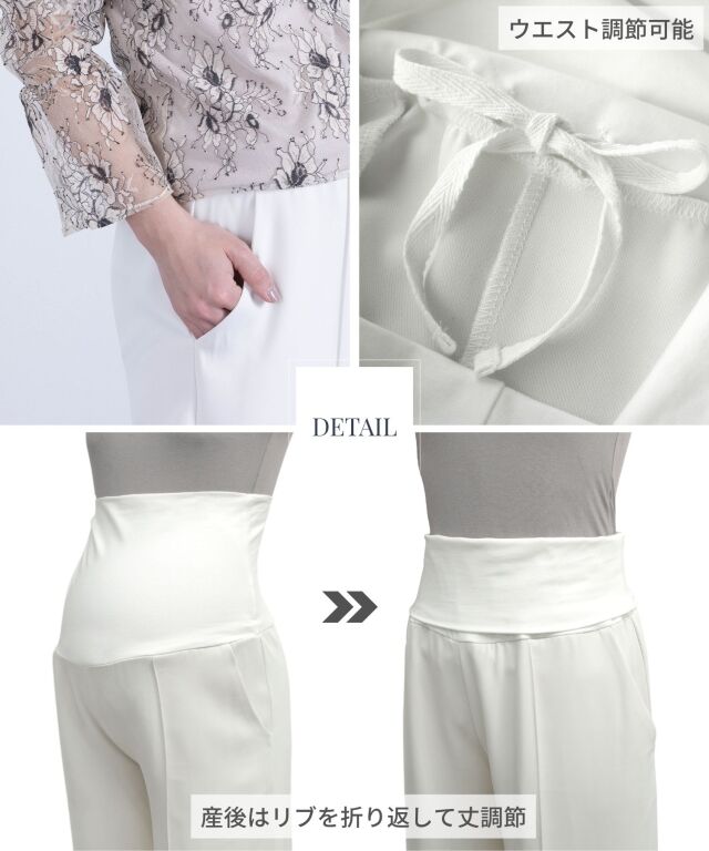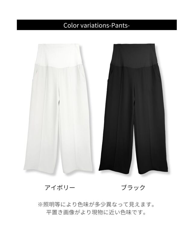 ベージュ グレー ブラック 黒 ホワイト 白 F センタープレス ワンピース マタニティ マタニティウェア マタニティワイドパンツ マタニティパンツ マタニティボトム 産前 産後 臨月 きれいめ 上品 大人可愛い 妊婦服 ゆったりサイズ ポケット付き ウエスト調節 無地 体型カバー 着痩せ 脚長 美脚 とろみ素材 コットンリブ リブ センターステッチ加工 妊婦 ママ 母親 春服 夏服 秋服 【カラー】アイボリー/ブラック/M/L