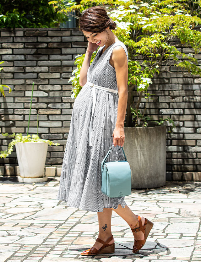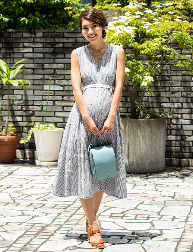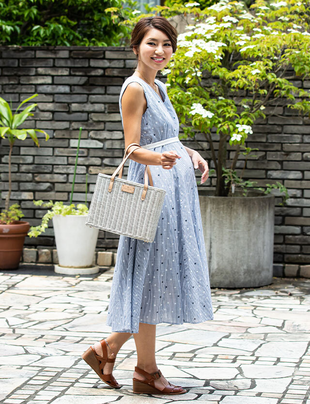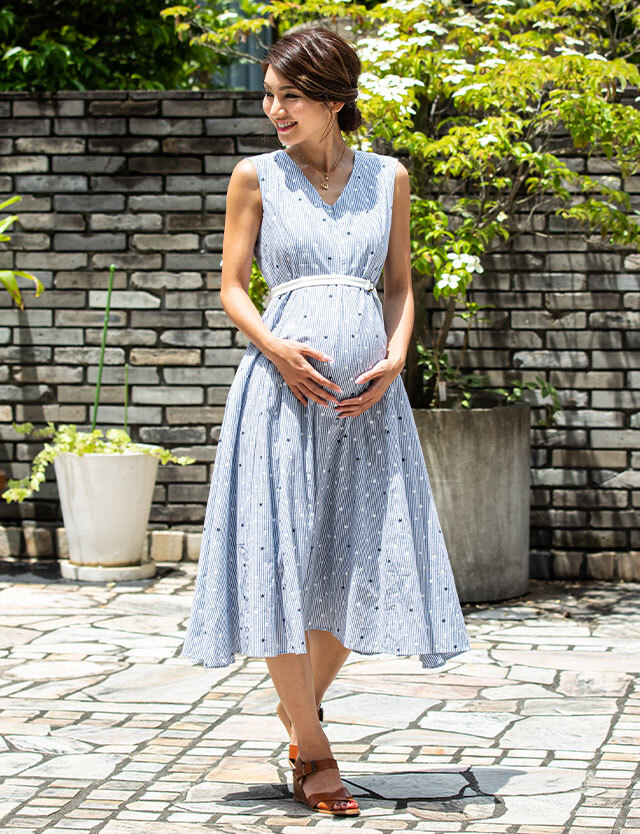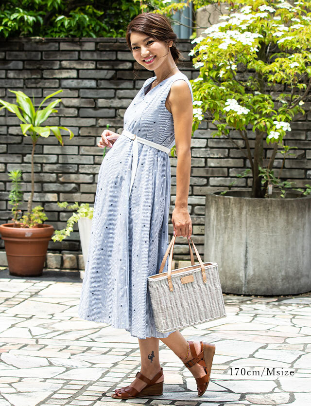 涼し気なストライプに可愛らしい星柄をミックスした大人可愛いロングワンピースです。春夏のお出かけやリゾートにもぴったりなトレンドアイテム。授乳服とマタニティウェアの通販専門店スウィートマミーがおすすめする優秀ワンピです。