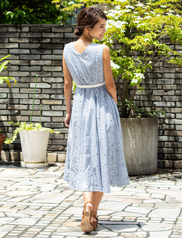 涼し気なストライプに可愛らしい星柄をミックスした大人可愛いロングワンピースです。