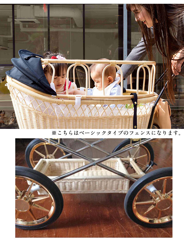 赤ちゃんの安全と快適さを最優先に考えて作られた乳母車。 スタンダードタイプは白を基調にしたエレガントなデザインが美しいです。 赤ちゃんはかごに包まれる安定感と安心感があり、楽な姿勢でのびのびと寝られるのは乳母車ならでは。