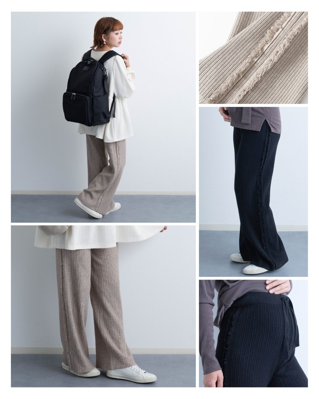 サイドのフリンジラインがポイント。美脚ラインを作る太畝リブパンツ。お腹の切替をなくしたデザインで、妊娠中のシャツインコーデや産後もそのまま使えます。